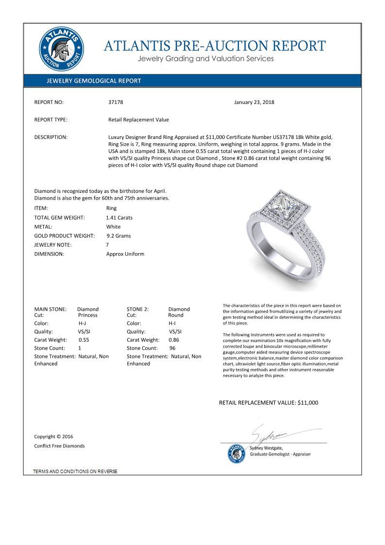 REF-200N2Y -37178 ---- 1.41 CTW Princess VS/SI Diamond Solitaire Micro Pave Ring 18K White Gold ---- Luxury Designer Brand Ring Appraised at $11,000 Certificate Number US37178 18k White gold, Ring Size is 7, Ring measuring approx. Uniform, weighing in total approx. 9 grams. Made in the USA and is stamped 18k, Main stone 0.55 carat total weight containing 1 pieces of H-J color with VS/SI quality Princess shape cut Diamond , Stone #2 0.86 carat total weight containing 96 pieces of H-I color with VS/SI quality Round shape cut Diamond