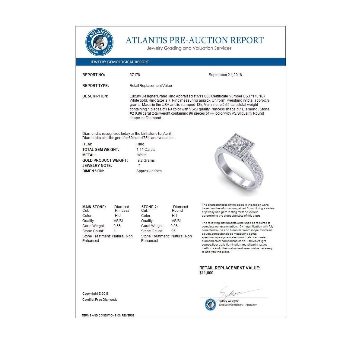 REF-200N2Y -37178 ---- 1.41 CTW Princess VS/SI Diamond Solitaire Micro Pave Ring 18K White Gold ---- Luxury Designer Brand Ring Appraised at $11,000 Certificate Number US37178 18k White gold, Ring Size is 7, Ring measuring approx. Uniform, weighing in total approx. 9 grams. Made in the USA and is stamped 18k, Main stone 0.55 carat total weight containing 1 pieces of H-J color with VS/SI quality Princess shape cut Diamond , Stone #2 0.86 carat total weight containing 96 pieces of H-I color with VS/SI quality Round shape cut Diamond