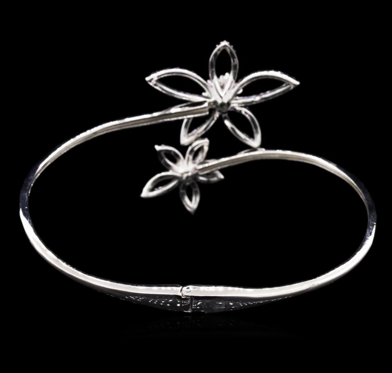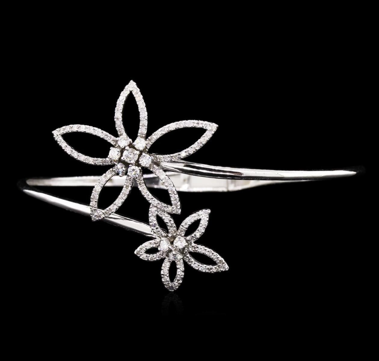 One electronically tested 14KT white gold lady's combination cast & assembled bangle bracelet with a hinged clasp with a bright polish finish. The featured bracelet measures 6.5 inches in length. Identified with markings of "K14". Condition is new, good workmanship. Containing: Thirteen prong set round brilliant cut diamonds, measuring 2.50 - 2.00 x 1.46mm (depth est.) approximate total weight of 13 Stones = 0.46ct. Graded in the setting. Clarity: SI-1 to SI-2. Color: H - I. Cut Good One Hundred Seventeen split prong set round brilliant cut diamonds, measuring 1.30 - 1.20 x 0.81mm (depth est.) approximate total weight of 117 Stones = 0.95ct. Graded in the setting. Clarity: SI-2 to I-1. Color: H - I. Cut Good. Total Weight of Diamonds 1.41ct. Total Weight of Bracelet 11.40gm. GAS Appraised.