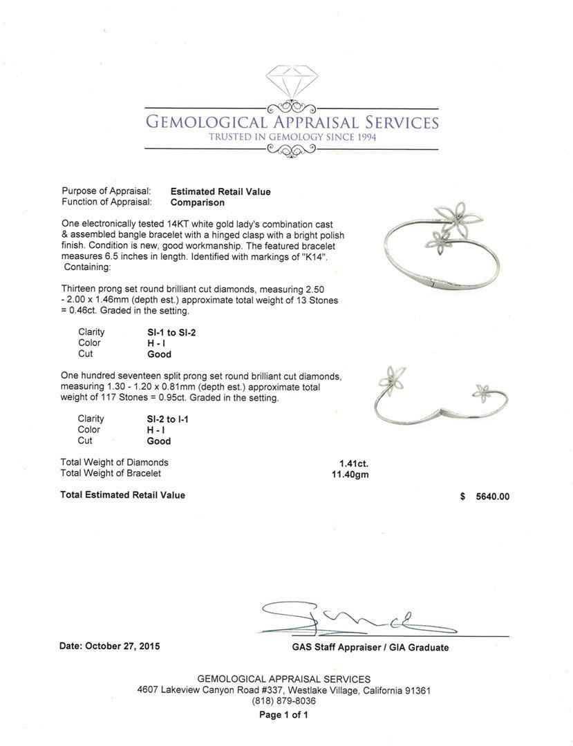 One electronically tested 14KT white gold lady's combination cast & assembled bangle bracelet with a hinged clasp with a bright polish finish. The featured bracelet measures 6.5 inches in length. Identified with markings of "K14". Condition is new, good workmanship. Containing: Thirteen prong set round brilliant cut diamonds, measuring 2.50 - 2.00 x 1.46mm (depth est.) approximate total weight of 13 Stones = 0.46ct. Graded in the setting. Clarity: SI-1 to SI-2. Color: H - I. Cut Good One Hundred Seventeen split prong set round brilliant cut diamonds, measuring 1.30 - 1.20 x 0.81mm (depth est.) approximate total weight of 117 Stones = 0.95ct. Graded in the setting. Clarity: SI-2 to I-1. Color: H - I. Cut Good. Total Weight of Diamonds 1.41ct. Total Weight of Bracelet 11.40gm. GAS Appraised.