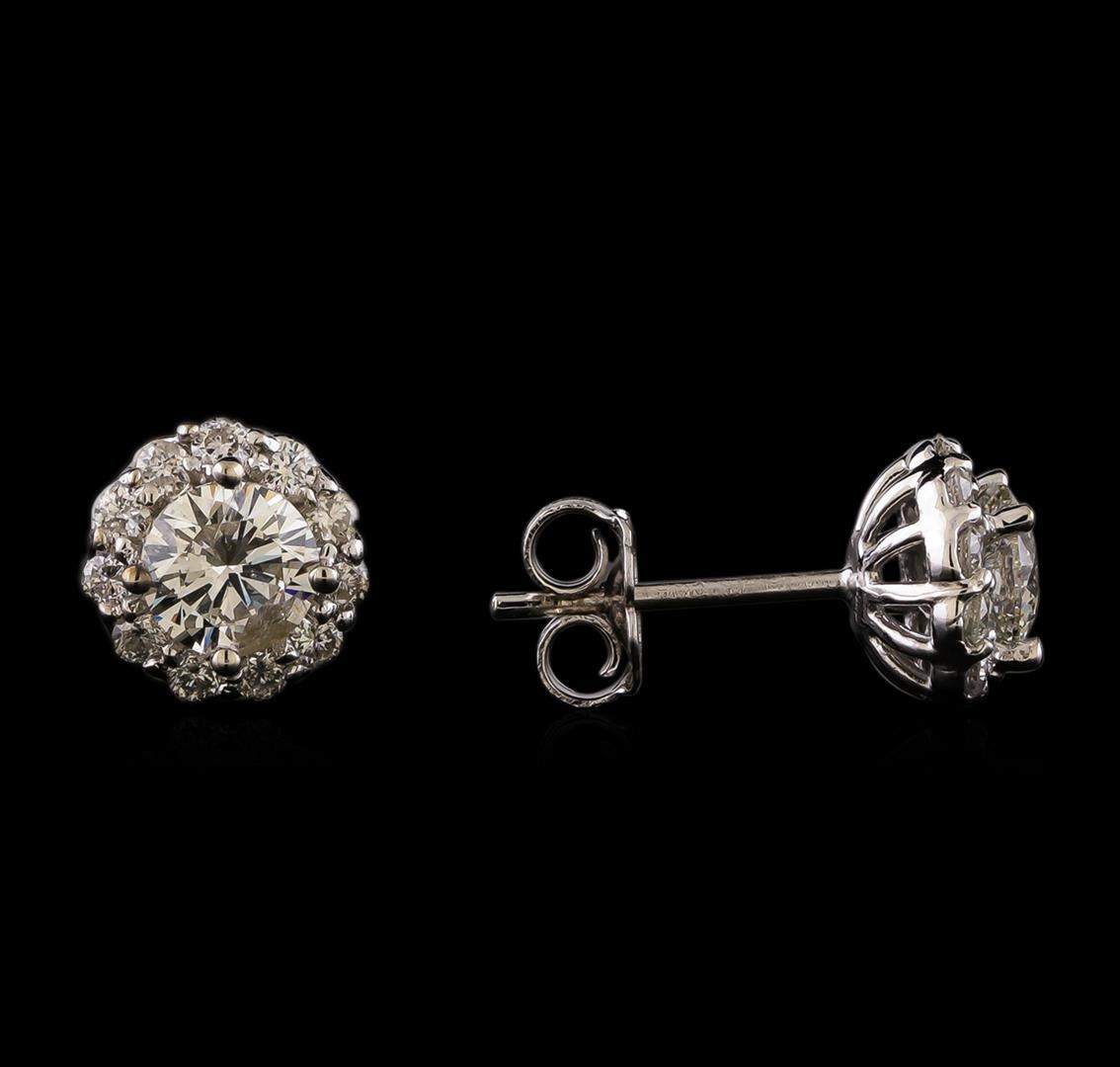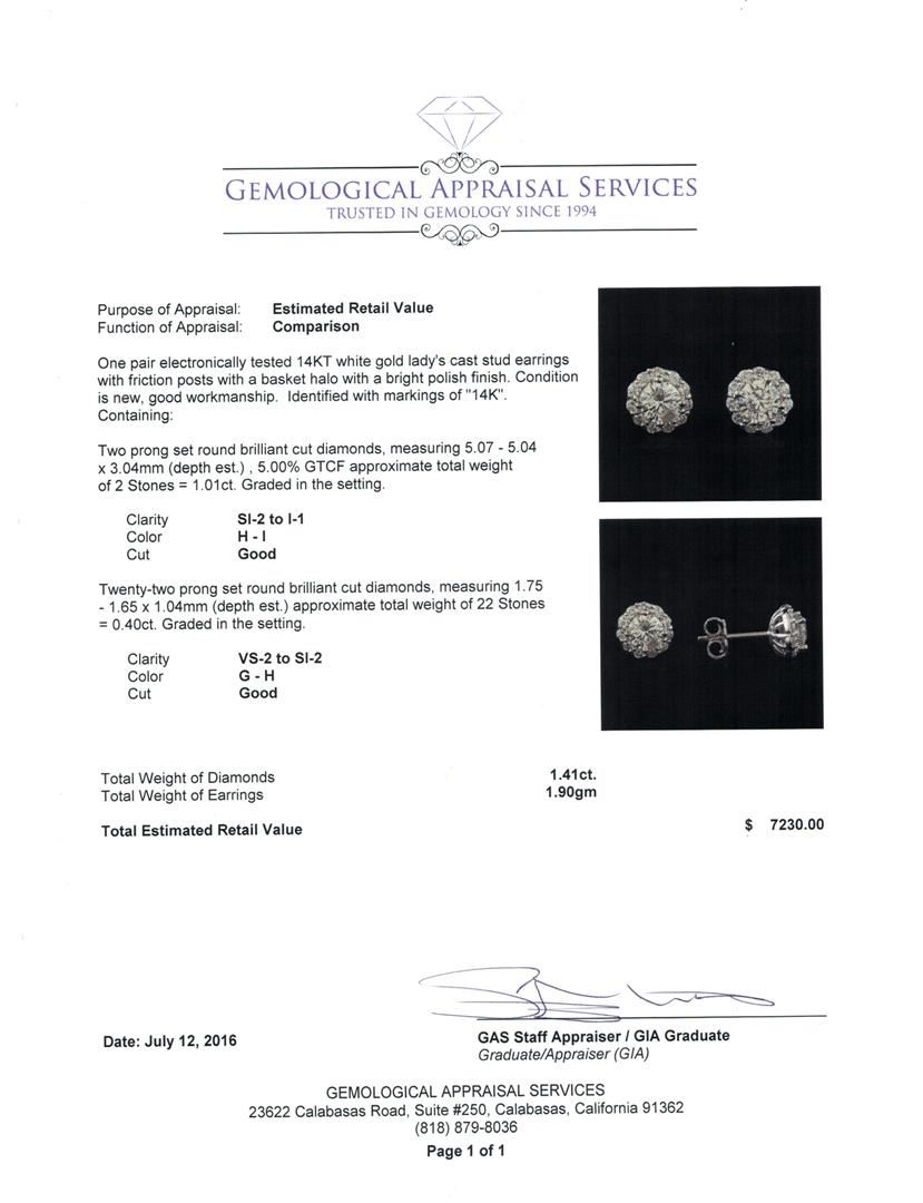 One pair electronically tested 14KT white gold lady's cast stud earrings with friction posts with a basket halo with a bright polish finish. Identified with markings of '14K'. Condition is new, good workmanship. Containing: Two prong set round brilliant cut diamonds, measuring 5.07 - 5.04 x 3.04mm (depth est.) , 5.00.%. GTCF approximate total weight of 2 Stones = 1.01ct. Graded in the setting. Clarity SI-2 to I-1. Color: H - I Cut Good Twenty-Two prong set round brilliant cut diamonds, measuring 1.75 - 1.65 x 1.04mm (depth est.) approximate total weight of 22 Stones = 0.40ct. Graded in the setting. Clarity VS-2 to SI-2. Color: G - H Cut Good. Total Weight of Diamonds 1.41ct.. Total Weight of Earrings 1.90gm. GAS Appraised at $7,230.00.