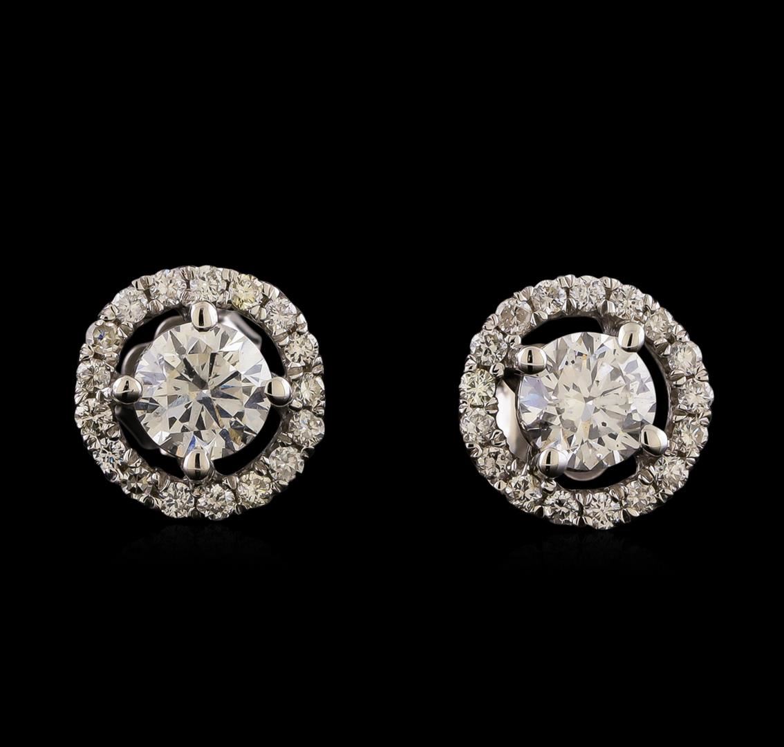 One pair electronically tested 14KT white gold lady's cast stud earrings with friction posts with a halo with a bright polish finish. Identified with markings of '14K'. Condition is new, good workmanship. Containing: Two prong set round brilliant cut diamonds, measuring 5.09 - 5.04 x 3.14mm (depth est.) , 7.00.%. GTCF approximate total weight of 2 Stones = 1.05ct. Graded in the setting. Clarity SI-1. Color: G - H Cut Good Thirty-Four prong set round brilliant cut diamonds, measuring 1.45 - 1.35 x 0.88mm (depth est.) approximate total weight of 34 Stones = 0.36ct. Graded in the setting. Clarity SI-1 to SI-2. Color: G - H Cut Good. Total Weight of Diamonds 1.41ct.. Total Weight of Earrings 2.60gm. GAS Appraised at $9,380.00.