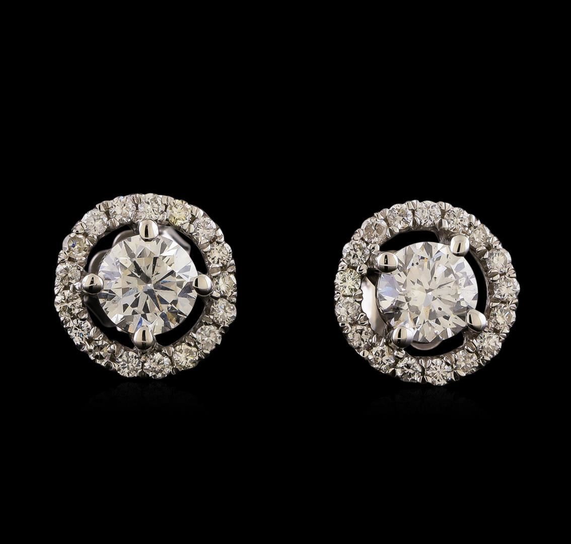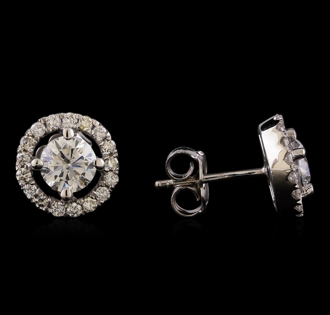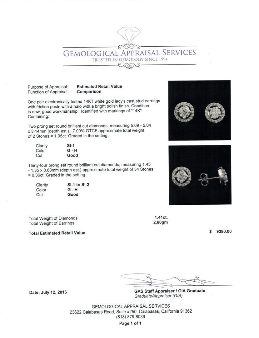 One pair electronically tested 14KT white gold lady's cast stud earrings with friction posts with a halo with a bright polish finish. Identified with markings of '14K'. Condition is new, good workmanship. Containing: Two prong set round brilliant cut diamonds, measuring 5.09 - 5.04 x 3.14mm (depth est.) , 7.00.%. GTCF approximate total weight of 2 Stones = 1.05ct. Graded in the setting. Clarity SI-1. Color: G - H Cut Good Thirty-Four prong set round brilliant cut diamonds, measuring 1.45 - 1.35 x 0.88mm (depth est.) approximate total weight of 34 Stones = 0.36ct. Graded in the setting. Clarity SI-1 to SI-2. Color: G - H Cut Good. Total Weight of Diamonds 1.41ct.. Total Weight of Earrings 2.60gm. GAS Appraised.