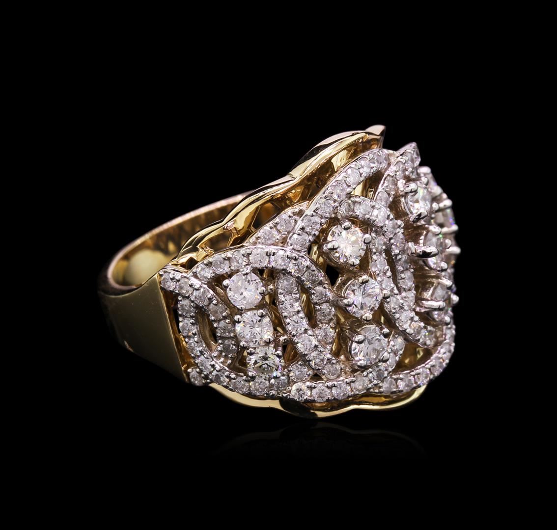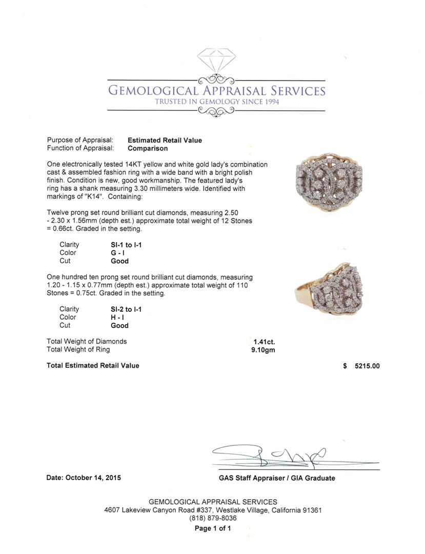 One electronically tested 14KT yellow and white gold lady's combination cast & assembled fashion ring with a wide band with a bright polish finish. The featured lady's ring has a shank measuring 3.30 millimeters wide. Identified with markings of "K14". Condition is new, good workmanship. Containing: Twelve prong set round brilliant cut diamonds, measuring 2.50 - 2.30 x 1.56mm (depth est.) approximate total weight of 12 Stones = 0.66ct. Graded in the setting. Clarity: SI-1 to I-1. Color: G - I. Cut Good One Hundred Ten prong set round brilliant cut diamonds, measuring 1.20 - 1.15 x 0.77mm (depth est.) approximate total weight of 110 Stones = 0.75ct. Graded in the setting. Clarity: SI-2 to I-1. Color: H - I. Cut Good. Total Weight of Diamonds 1.41ct. Total Weight of Ring 9.10gm. GAS Appraised at $5,215.00.
