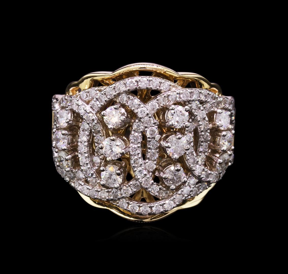 One electronically tested 14KT yellow and white gold lady's combination cast & assembled fashion ring with a wide band with a bright polish finish. The featured lady's ring has a shank measuring 3.30 millimeters wide. Identified with markings of "K14". Condition is new, good workmanship. Containing: Twelve prong set round brilliant cut diamonds, measuring 2.50 - 2.30 x 1.56mm (depth est.) approximate total weight of 12 Stones = 0.66ct. Graded in the setting. Clarity: SI-1 to I-1. Color: G - I. Cut Good One Hundred Ten prong set round brilliant cut diamonds, measuring 1.20 - 1.15 x 0.77mm (depth est.) approximate total weight of 110 Stones = 0.75ct. Graded in the setting. Clarity: SI-2 to I-1. Color: H - I. Cut Good. Total Weight of Diamonds 1.41ct. Total Weight of Ring 9.10gm. GAS Appraised at $5,215.00.
