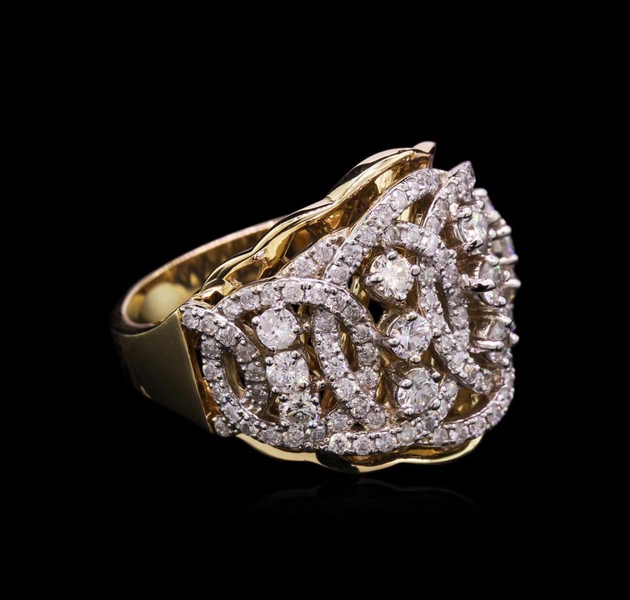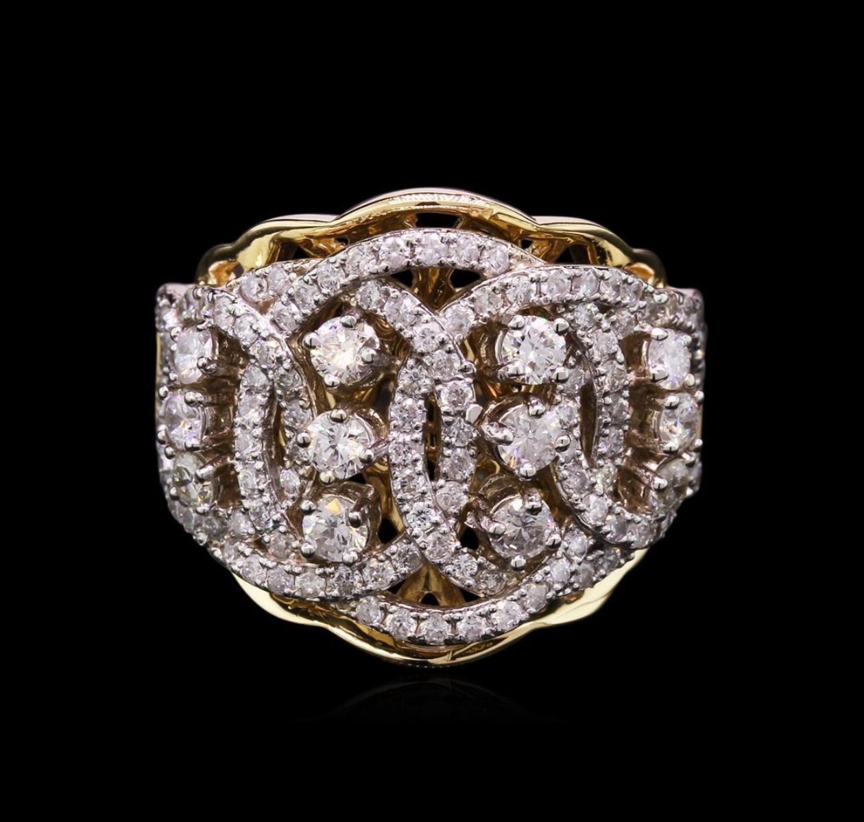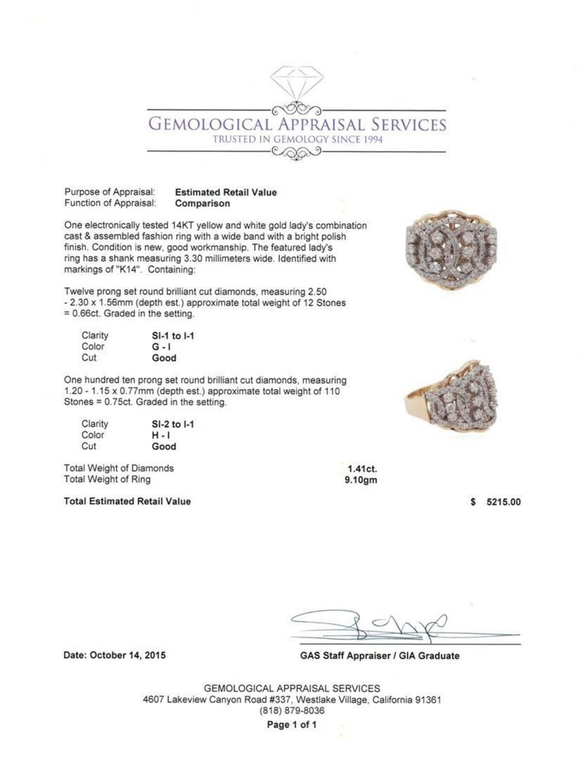 One electronically tested 14KT yellow and white gold lady's combination cast & assembled fashion ring with a wide band with a bright polish finish. The featured lady's ring has a shank measuring 3.30 millimeters wide. Identified with markings of "K14". Condition is new, good workmanship. Containing: Twelve prong set round brilliant cut diamonds, measuring 2.50 - 2.30 x 1.56mm (depth est.) approximate total weight of 12 Stones = 0.66ct. Graded in the setting. Clarity: SI-1 to I-1. Color: G - I. Cut Good One Hundred Ten prong set round brilliant cut diamonds, measuring 1.20 - 1.15 x 0.77mm (depth est.) approximate total weight of 110 Stones = 0.75ct. Graded in the setting. Clarity: SI-2 to I-1. Color: H - I. Cut Good. Total Weight of Diamonds 1.41ct. Total Weight of Ring 9.10gm. GAS Appraised.