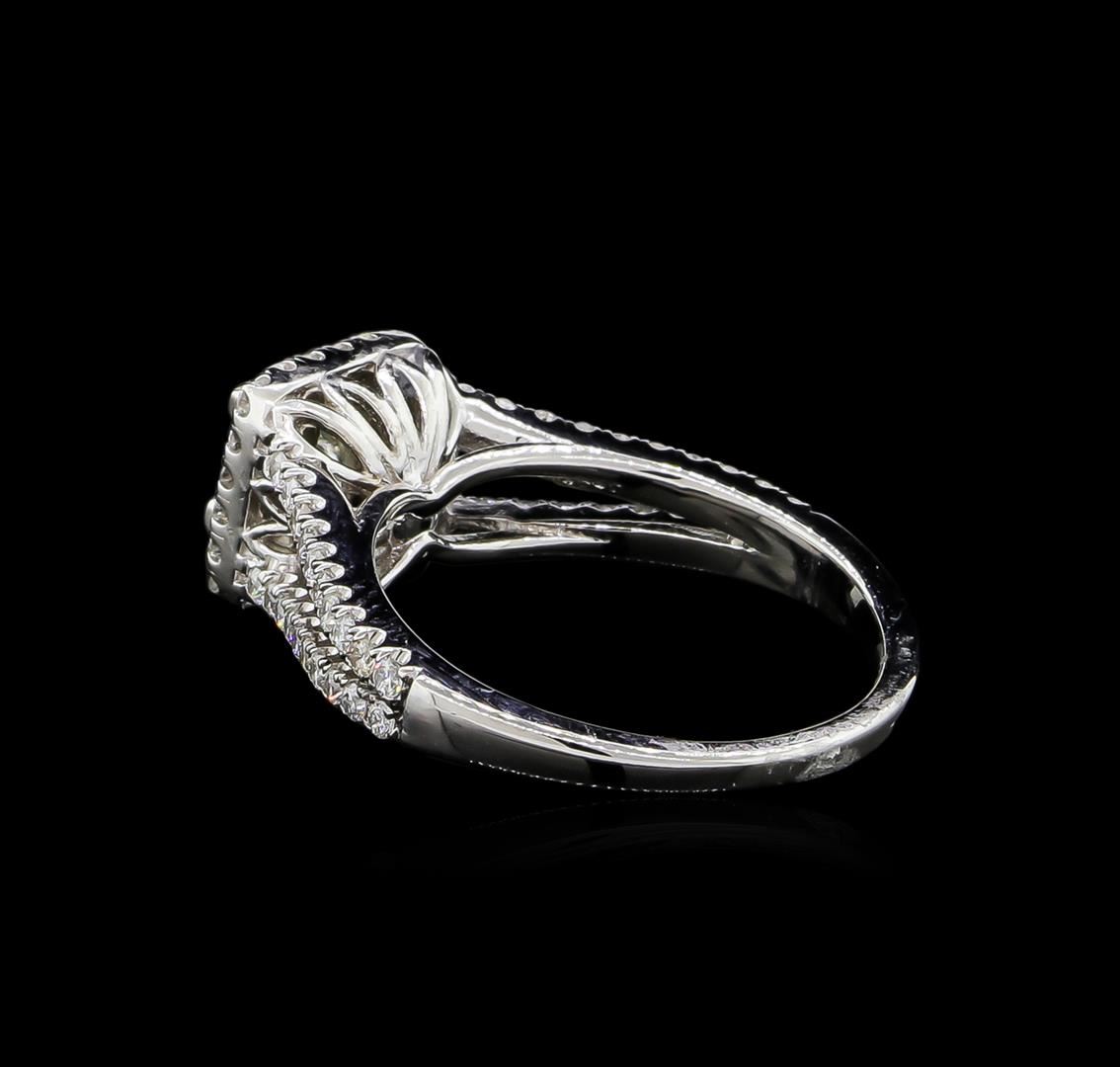 One electronically tested 14KT white gold ladies cast diamond unity ring with a bright polish finish. The featured diamond is set within a diamond bezel supported by a tuliped under gallery and diamond set split shoulders, completed by a one millimeter wide band. Identified with markings of "14K". Condition is good. Containing: One prong set princess cut diamond, measuring 5.00 x 5.00 x 3.70mm (depth est.) approximate weight of 0.76ct. Graded in the setting. Clarity: I-1. Color: I. Depth 74.0%. Table 71.0%. Sixty prong set round brilliant cut diamonds, measuring 1.40 - 1.40 x 0.84mm (depth est.) approximate total weight of 60 Stones = 0.65ct. Graded in the setting. Clarity: SI-1 to SI-2. Color: G - I. Total Weight of Diamonds 1.41ct. Total Weight of Ring 5.25gm. AIG Appraised at $6,820.00.