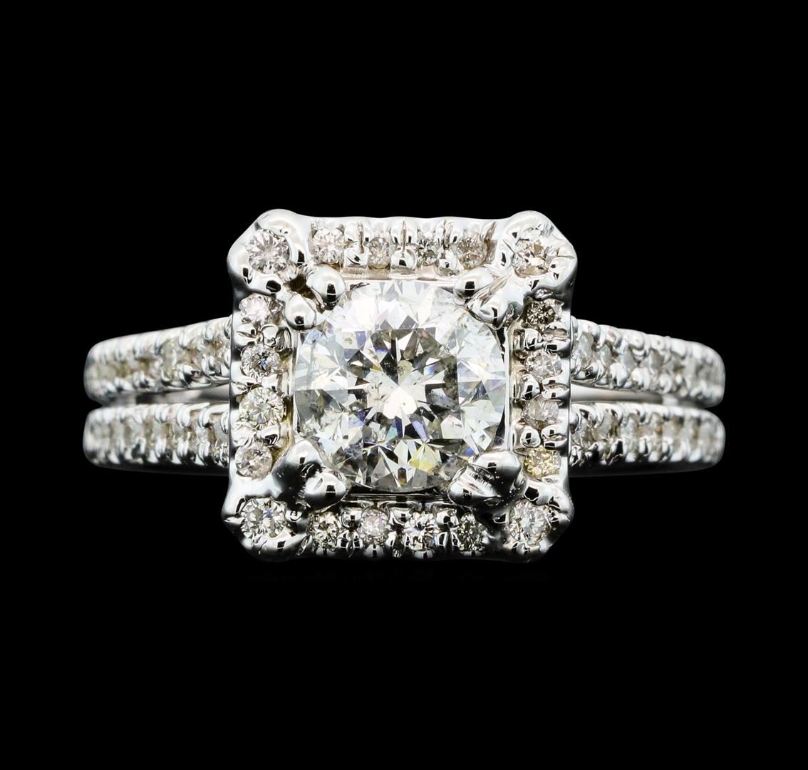 One electronically tested 14KT white gold lady's cast wedding ring with a split cathedral shank with a halo with a bright polish finish. The featured lady's ring has a double shank measuring 3.46 millimeters wide. Identified with markings of '14K'. Condition is new, good workmanship. Containing: One prong set round brilliant cut diamond, measuring 6.28 - 6.25 x 4.30mm (depth est.) approximate weight of 1.04ct. Graded in the setting. Clarity I-1. Color: I - J Cut Very Good Four prong set round brilliant cut diamonds, measuring 1.50 - 1.40 x 0.90mm (depth est.) approximate total weight of 4 Stones = 0.05ct. Graded in the setting. Clarity SI-1 to SI-2. Color: H - I Cut Good Fifty-Six prong set round brilliant cut diamonds, measuring 1.20 - 1.10 x 0.71mm (depth est.) approximate total weight of 56 Stones = 0.32ct. Graded in the setting. Clarity SI-2 to I-1. Color: H - I Cut Good. Total Weight of Diamonds 1.41ct.. Total Weight of Ring 5.80gm. GAS Appraised at $10,955.00.