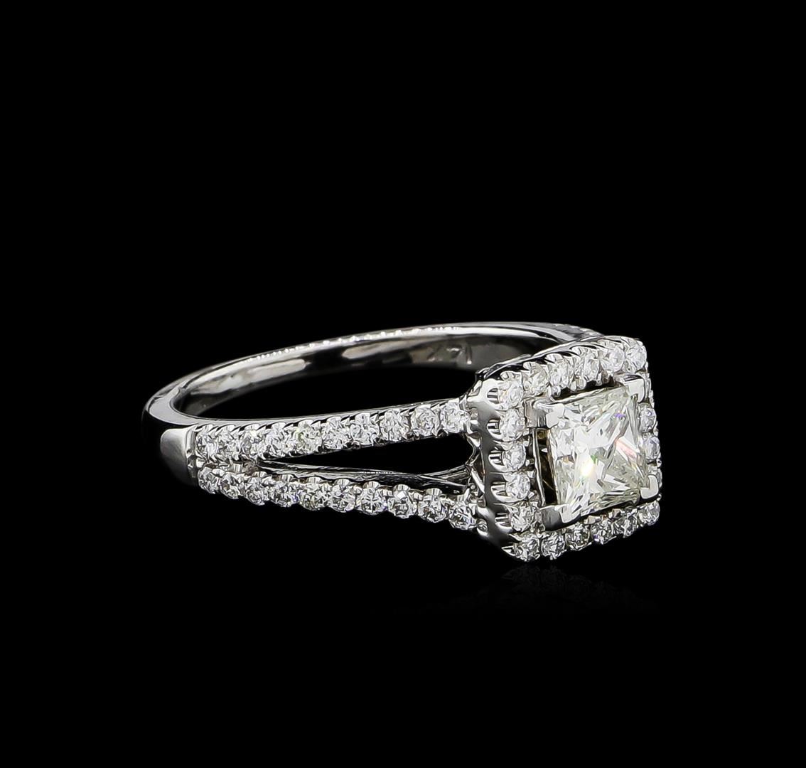 One electronically tested 14KT white gold ladies cast diamond unity ring with a bright polish finish. The featured diamond is set within a diamond bezel supported by a tuliped under gallery and diamond set split shoulders, completed by a one millimeter wide band. Identified with markings of "14K". Condition is good. Containing: One prong set princess cut diamond, measuring 5.00 x 5.00 x 3.70mm (depth est.) approximate weight of 0.76ct. Graded in the setting. Clarity: I-1. Color: I. Depth 74.0%. Table 71.0%. Sixty prong set round brilliant cut diamonds, measuring 1.40 - 1.40 x 0.84mm (depth est.) approximate total weight of 60 Stones = 0.65ct. Graded in the setting. Clarity: SI-1 to SI-2. Color: G - I. Total Weight of Diamonds 1.41ct. Total Weight of Ring 5.25gm. AIG Appraised at $6,820.00.