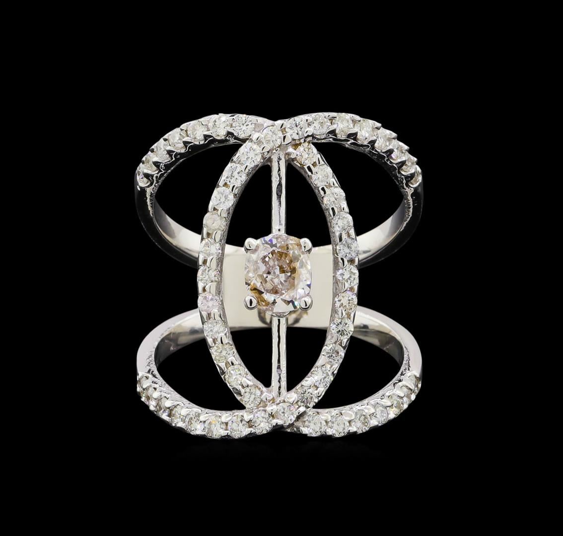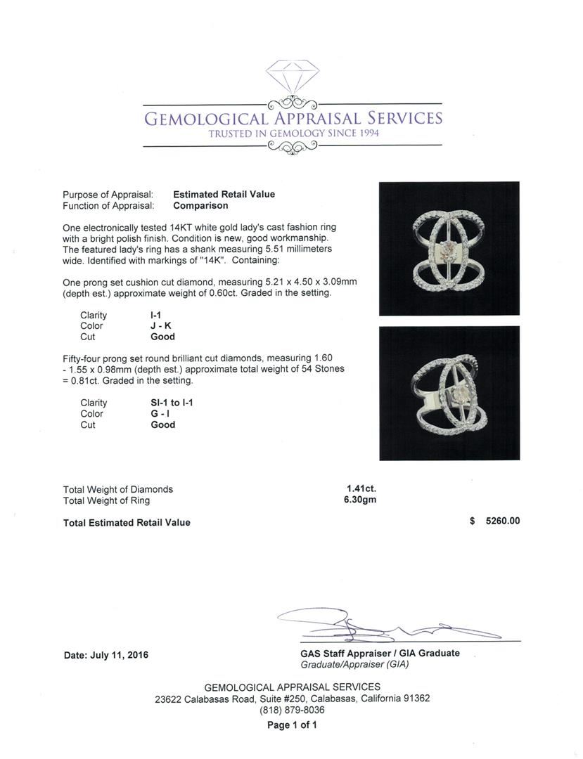One electronically tested 14KT white gold lady's cast fashion ring with a bright polish finish. The featured lady's ring has a shank measuring 5.51 millimeters wide. Identified with markings of '14K'. Condition is new, good workmanship. Containing: One prong set cushion cut diamond, measuring 5.21 x 4.50 x 3.09mm (depth est.) approximate weight of 0.60ct. Graded in the setting. Clarity I-1. Color: J - K Cut Good Fifty-Four prong set round brilliant cut diamonds, measuring 1.60 - 1.55 x 0.98mm (depth est.) approximate total weight of 54 Stones = 0.81ct. Graded in the setting. Clarity SI-1 to I-1. Color: G - I Cut Good. Total Weight of Diamonds 1.41ct.. Total Weight of Ring 6.30gm. GAS Appraised at $5,260.00.