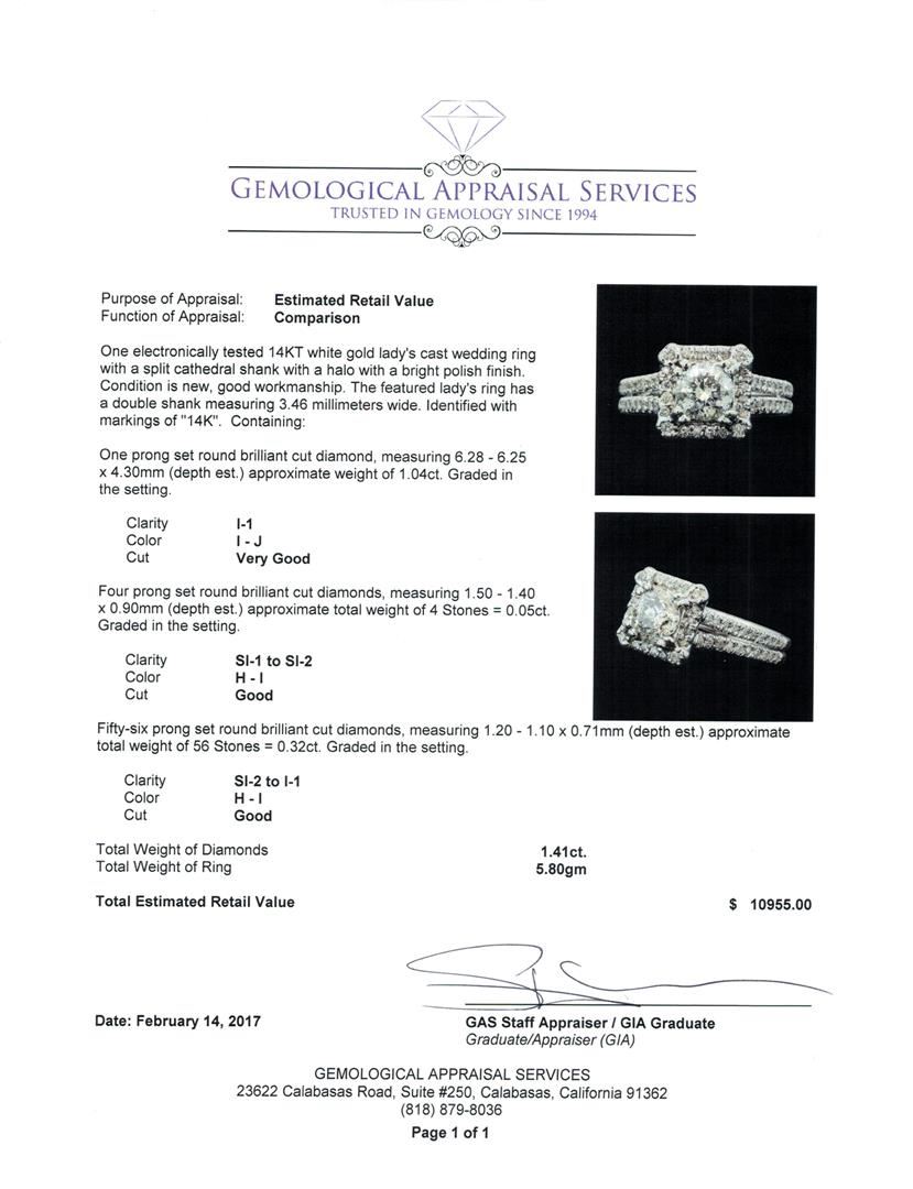 One electronically tested 14KT white gold lady's cast wedding ring with a split cathedral shank with a halo with a bright polish finish. The featured lady's ring has a double shank measuring 3.46 millimeters wide. Identified with markings of '14K'. Condition is new, good workmanship. Containing: One prong set round brilliant cut diamond, measuring 6.28 - 6.25 x 4.30mm (depth est.) approximate weight of 1.04ct. Graded in the setting. Clarity I-1. Color: I - J Cut Very Good Four prong set round brilliant cut diamonds, measuring 1.50 - 1.40 x 0.90mm (depth est.) approximate total weight of 4 Stones = 0.05ct. Graded in the setting. Clarity SI-1 to SI-2. Color: H - I Cut Good Fifty-Six prong set round brilliant cut diamonds, measuring 1.20 - 1.10 x 0.71mm (depth est.) approximate total weight of 56 Stones = 0.32ct. Graded in the setting. Clarity SI-2 to I-1. Color: H - I Cut Good. Total Weight of Diamonds 1.41ct.. Total Weight of Ring 5.80gm. GAS Appraised at $10,955.00.