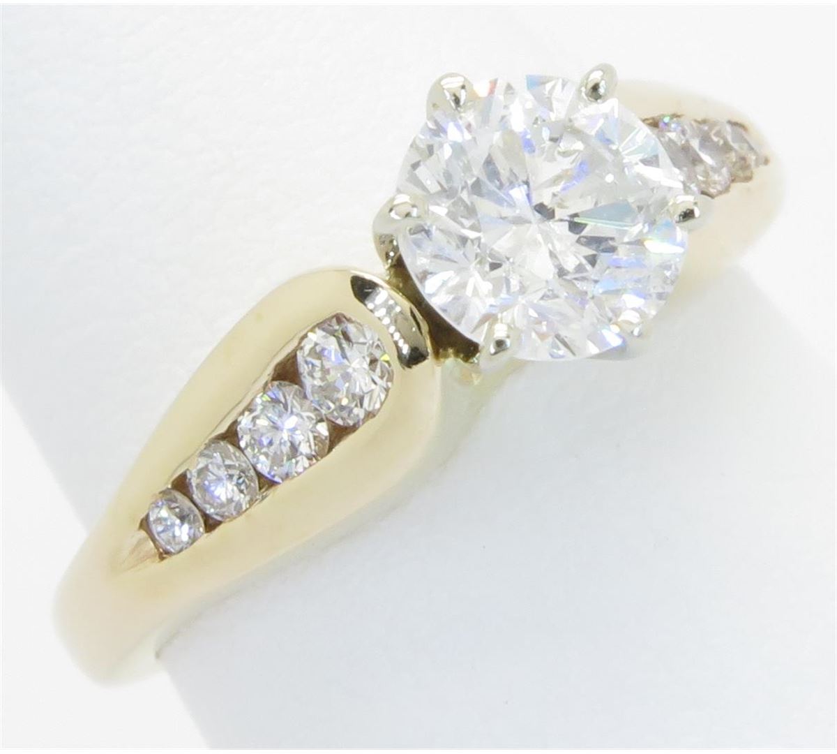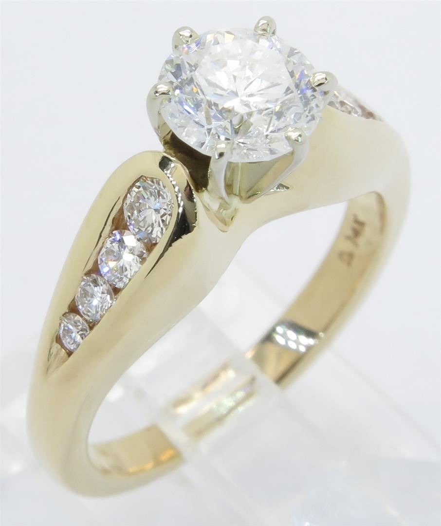 One tested 14K yellow gold diamond ring. Containing: One Round Brilliant Cut Diamond. Approximate Size: 1.06CT, Clarity: I, Color: G-H. 8 Round Brilliant Cut Diamonds. Approximate total diamond weight: 1.41CTW. Diamonds are graded in the mounting, unless otherwise stated. Weight of ring: 5.5 grams. Size: 5.75.