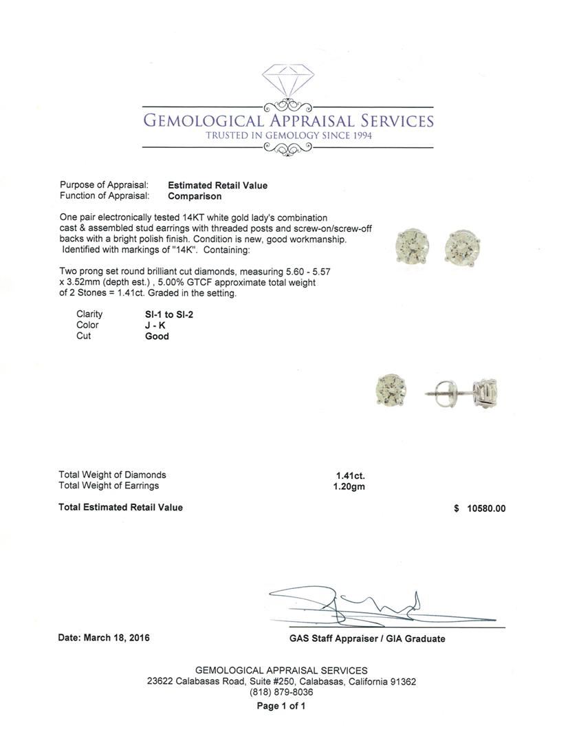 One pair electronically tested 14KT white gold lady's combination cast & assembled stud earrings with threaded posts and screw-on/screw-off backs with a bright polish finish. Identified with markings of "14K". Condition is new, good workmanship. Containing: Two prong set round brilliant cut diamonds, measuring 5.60 - 5.57 x 3.52mm (depth est.) , 5.00.%. GTCF approximate total weight of 2 Stones = 1.41ct. Graded in the setting. Clarity: SI-1 to SI-2. Color: J - Good. Total Weight of Diamonds 1.41ct. Total Weight of Earrings 1.20gm. GAS Appraised at $10,580.00.