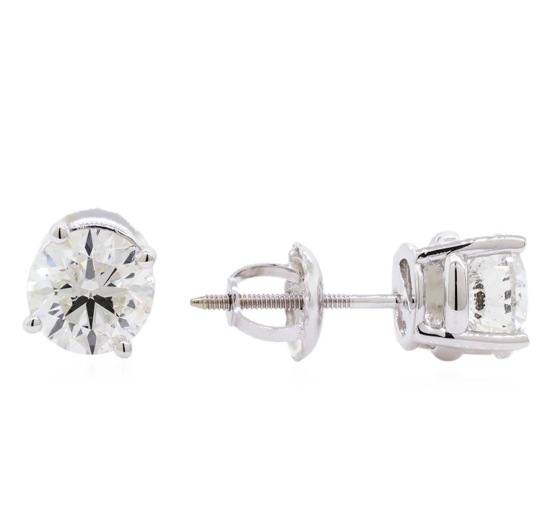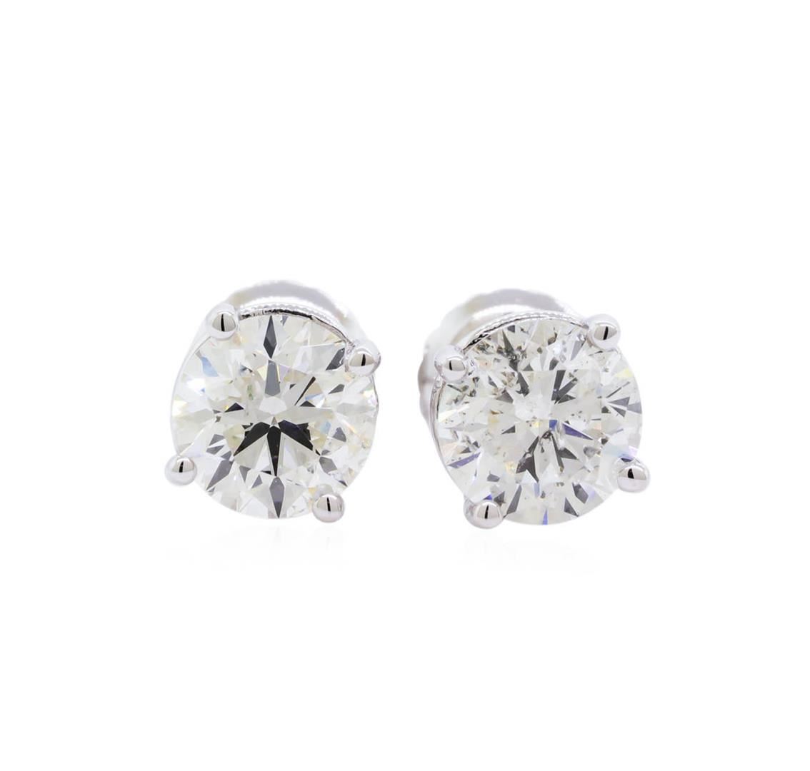 One pair electronically tested 14KT white gold lady's combination cast & assembled stud earrings with threaded posts and screw-on/screw-off backs with a bright polish finish. Identified with markings of "14K". Condition is new, good workmanship. Containing: Two prong set round brilliant cut diamonds, measuring 5.62 - 5.57 x 3.53mm (depth est.) approximate total weight of 2 Stones = 1.41ct. Graded in the setting. Clarity: SI-2. Color: H - I. Cut Very Good. Total Weight of Diamonds 1.41ct. Total Weight of Earrings 1.20gm. GAS Appraised at $11,190.00.