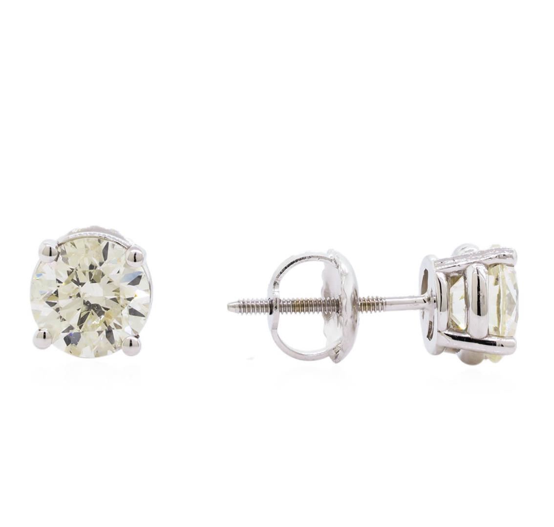 One pair electronically tested 14KT white gold lady's combination cast & assembled stud earrings with threaded posts and screw-on/screw-off backs with a bright polish finish. Identified with markings of "14K". Condition is new, good workmanship. Containing: Two prong set round brilliant cut diamonds, measuring 5.60 - 5.57 x 3.52mm (depth est.) , 5.00.%. GTCF approximate total weight of 2 Stones = 1.41ct. Graded in the setting. Clarity: SI-1 to SI-2. Color: J - Good. Total Weight of Diamonds 1.41ct. Total Weight of Earrings 1.20gm. GAS Appraised at $10,580.00.