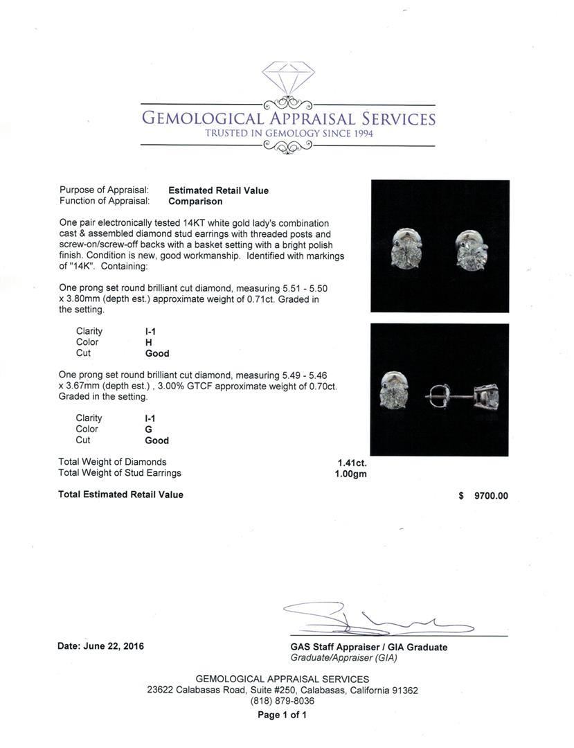 One pair electronically tested 14KT white gold lady's combination cast & assembled diamond stud earrings with threaded posts and screw-on/screw-off backs with a basket setting with a bright polish finish. Identified with markings of "14K". Condition is new, good workmanship. Containing: One prong set round brilliant cut diamond, measuring 5.51 - 5.50 x 3.80mm (depth est.) approximate weight of 0.71ct. Graded in the setting. Clarity: I-1. Color: Good One prong set round brilliant cut diamond, measuring 5.49 - 5.46 x 3.67mm (depth est.) , 3.00.%. GTCF approximate weight of 0.70 ct. Graded in the setting. Clarity: I-1. Color: Good. Total Weight of Diamonds 1.41ct. Total Weight of Stud Earrings 1.00gm. GAS Appraised.