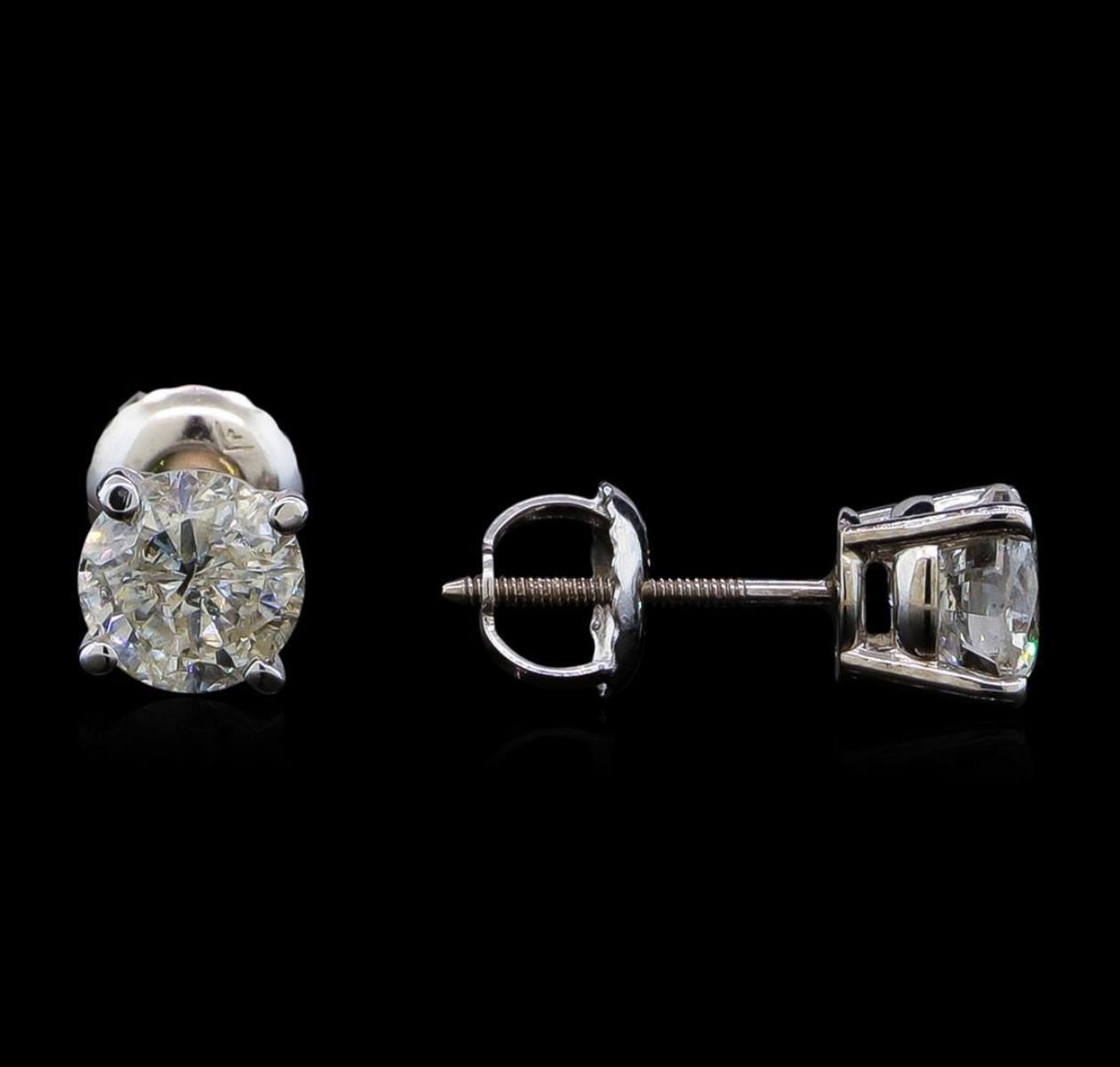 One pair electronically tested 14KT white gold lady's combination cast & assembled diamond stud earrings with threaded posts and screw-on/screw-off backs with a basket setting with a bright polish finish. Identified with markings of "14K". Condition is new, good workmanship. Containing: One prong set round brilliant cut diamond, measuring 5.51 - 5.50 x 3.80mm (depth est.) approximate weight of 0.71ct. Graded in the setting. Clarity: I-1. Color: Good One prong set round brilliant cut diamond, measuring 5.49 - 5.46 x 3.67mm (depth est.) , 3.00.%. GTCF approximate weight of 0.70 ct. Graded in the setting. Clarity: I-1. Color: Good. Total Weight of Diamonds 1.41ct. Total Weight of Stud Earrings 1.00gm. GAS Appraised.