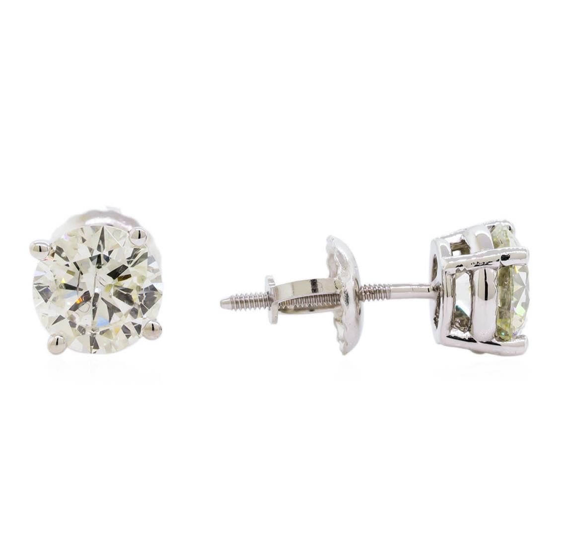 One pair electronically tested 14KT white gold lady's combination cast & assembled stud earrings with threaded posts and screw-on/screw-off backs with a bright polish finish. Identified with markings of "14K". Condition is new, good workmanship. Containing: Two prong set round brilliant cut diamonds, measuring 5.75 - 5.70 x 3.55mm (depth est.) approximate total weight of 2 Stones = 1.41ct. Graded in the setting. Clarity: VS-2 to SI-2. Color: I - J. Cut Very Good. Total Weight of Diamonds 1.41ct. Total Weight of Earrings 1.20gm. GAS Appraised.