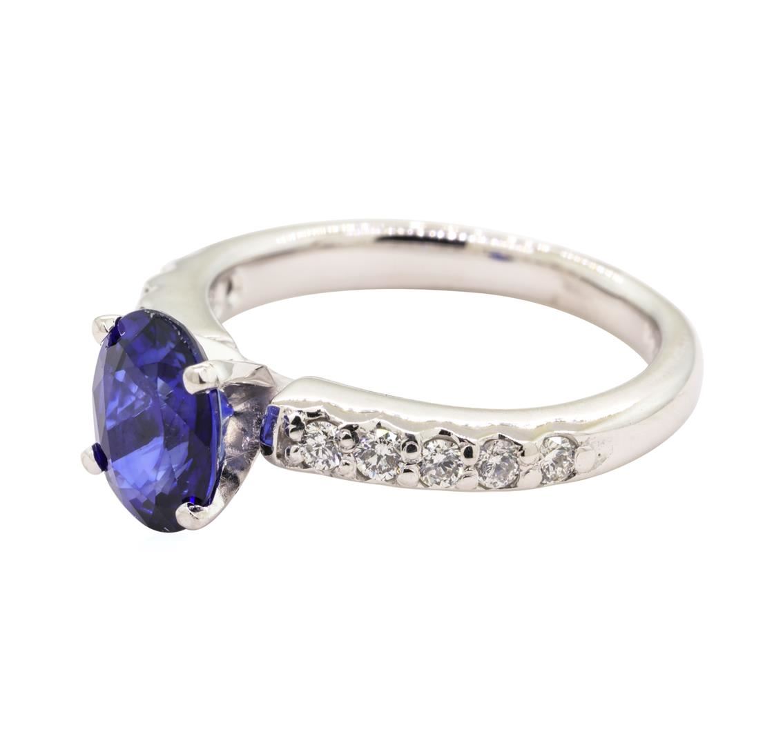 One lady's ring featuring: 14KT white gold weighing 3.5 grams containing one fine blue oval sapphire weighing 1.41ct and ten round brilliant diamonds weighing 0.30ctw.