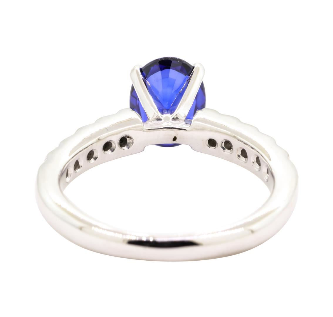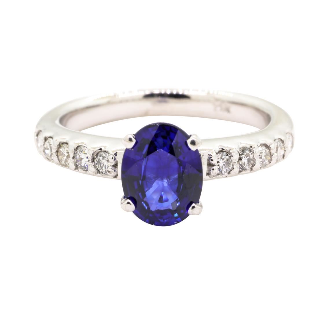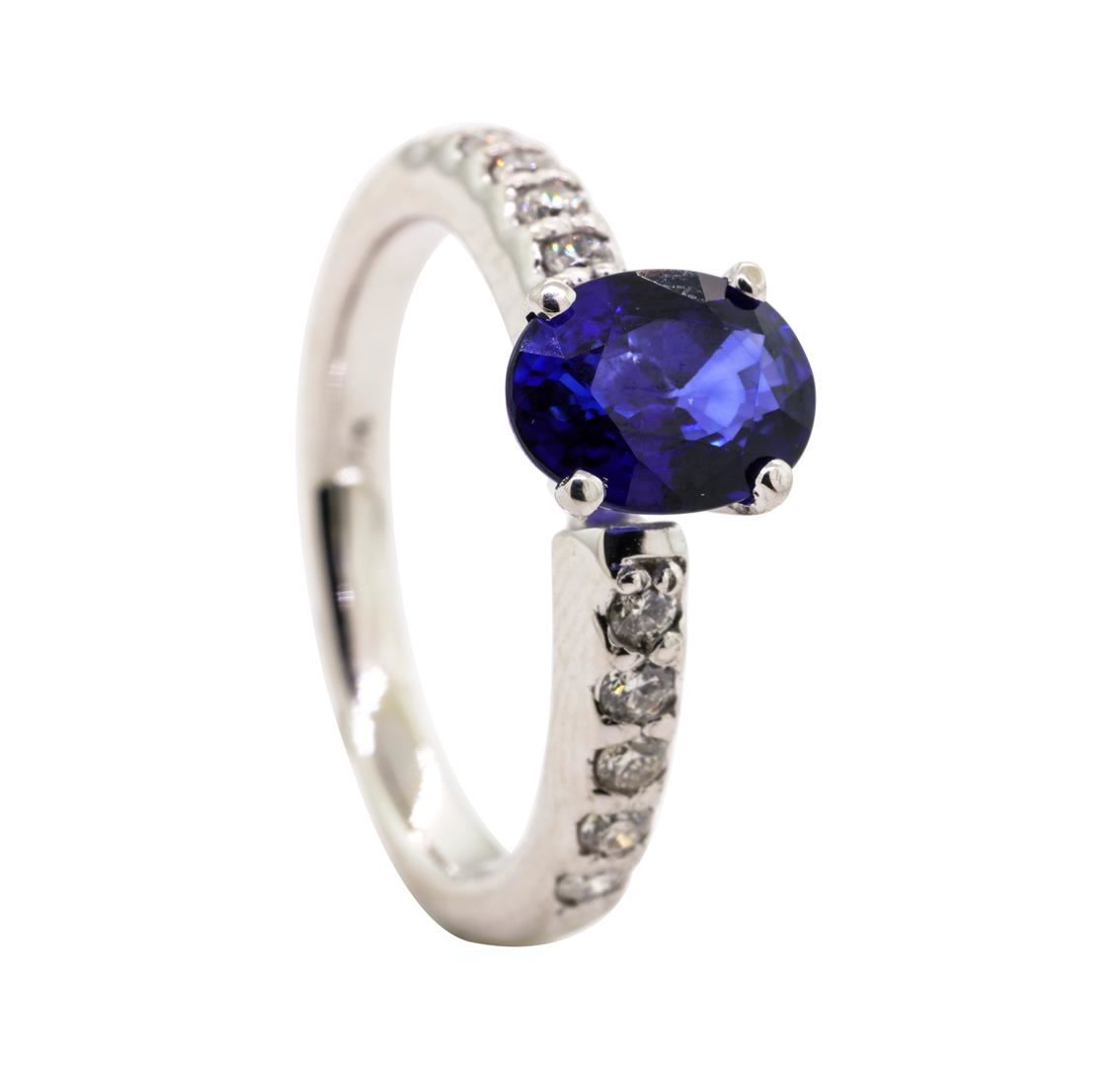 One lady's ring featuring: 14KT white gold weighing 3.5 grams containing one fine blue oval sapphire weighing 1.41ct and ten round brilliant diamonds weighing 0.30ctw.