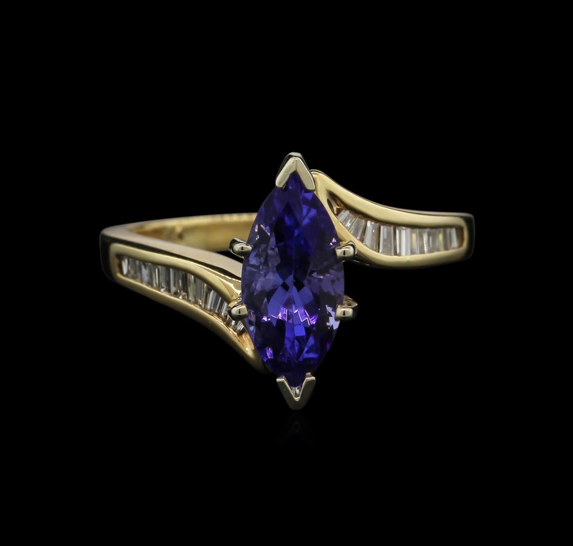 One ring featuring: 18KT yellow gold weighing 3.61 grams containing one prong set marquise cut tanzanite center stone with a total weight of 1.41ct and channel set baguette cut diamonds with a total weight of 0.20ct.