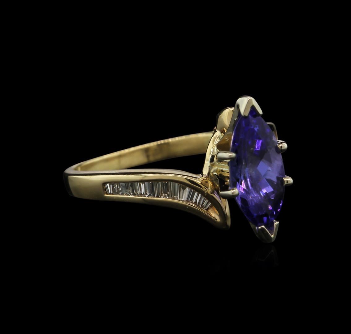 One ring featuring: 18KT yellow gold weighing 3.61 grams containing one prong set marquise cut tanzanite center stone with a total weight of 1.41ct and channel set baguette cut diamonds with a total weight of 0.20ct.