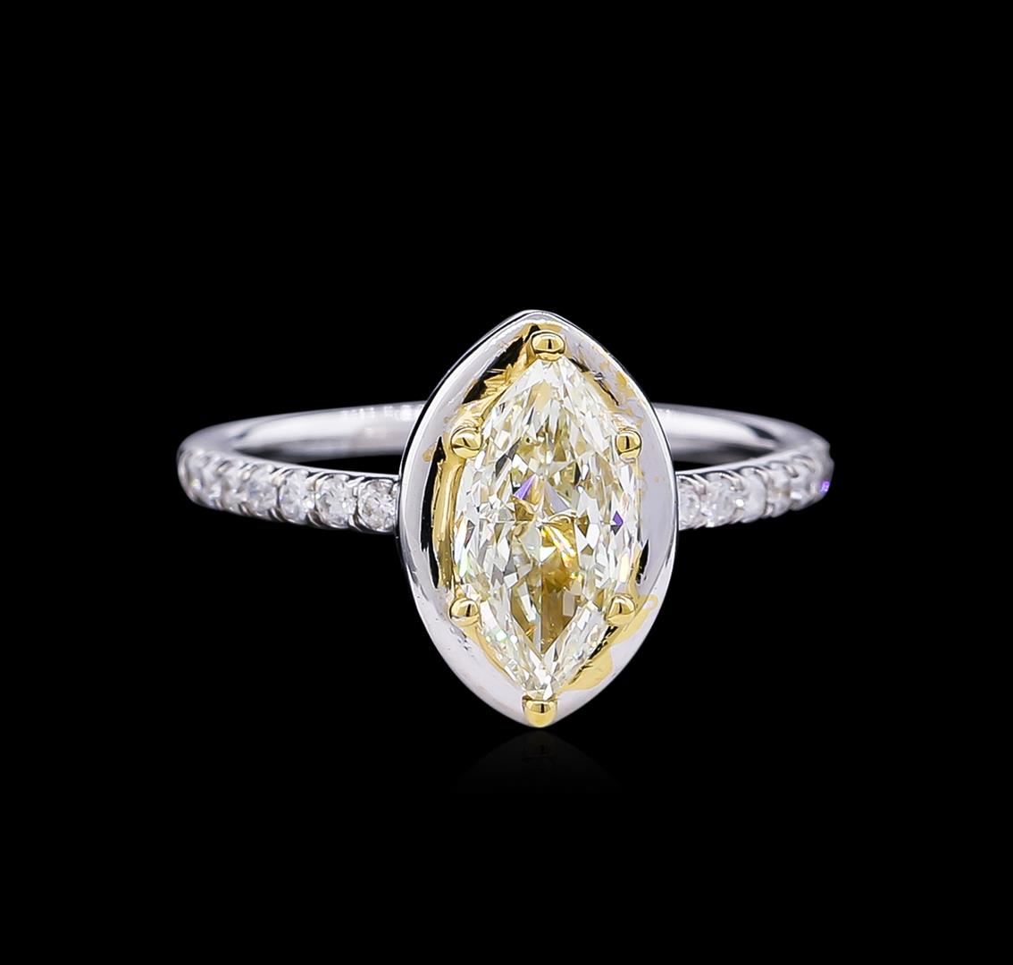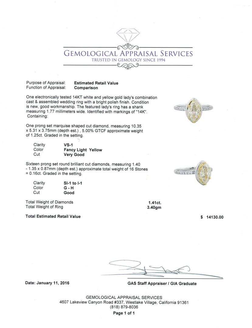 One electronically tested 14KT white and yellow gold lady's combination cast & assembled wedding ring with a bright polish finish. The featured lady's ring has a shank measuring 1.77 millimeters wide. Identified with markings of "14K". Condition is new, good workmanship. Containing: One prong set marquise shaped cut diamond, measuring 10.35 x 5.31 x 3.75mm (depth est.) , 5.00.%. GTCF approximate weight of 1.25ct. Graded in the setting. Clarity: VS-1 Cut Very Good Sixteen prong set round brilliant cut diamonds, measuring 1.40 - 1.35 x 0.87mm (depth est.) approximate total weight of 16 Stones = 0.16ct. Graded in the setting. Clarity: SI-1 to I-1. Color: G - Good. Total Weight of Diamonds 1.41ct. Total Weight of Ring 3.40gm. GAS Appraised at $14,130.00.