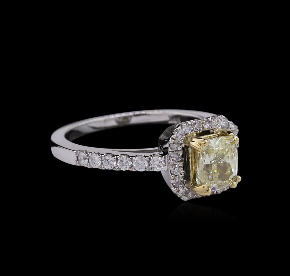 One electronically tested 14KT white and yellow gold lady's combination cast & assembled wedding ring with a cathedral shank with a bright polish finish. The featured lady's ring has a shank measuring 1.63 millimeters wide. Identified with markings of "14K". Condition is new, good workmanship. Containing: One prong set cushion cut diamond, measuring 5.80 x 5.30 x 3.29mm (depth est.) , 15.00.%. GTCF approximate weight of 1.01ct. Graded in the setting. Clarity: I-1 Cut Good Twelve prong set round brilliant cut diamonds, measuring 1.70 - 1.60 x 1.01mm (depth est.) approximate total weight of 12 Stones = 0.20ct. Graded in the setting. Clarity: SI-2 to I-1. Color: G - Good Twenty prong set round brilliant cut diamonds, measuring 1.40 - 1.35 x 0.86mm (depth est.) approximate total weight of 20 Stones = 0.20ct. Graded in the setting. Clarity: SI-1 to I-1. Color: H - I. Cut Good. Total Weight of Diamonds 1.41ct. Total Weight of Ring 3.70gm. GAS Appraised at $10,125.00.