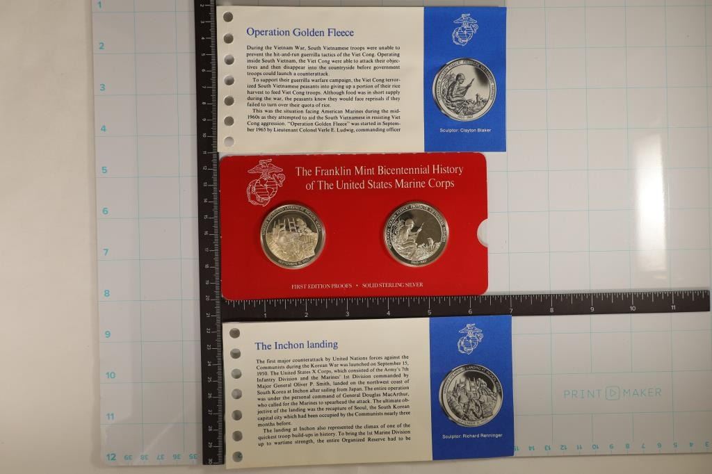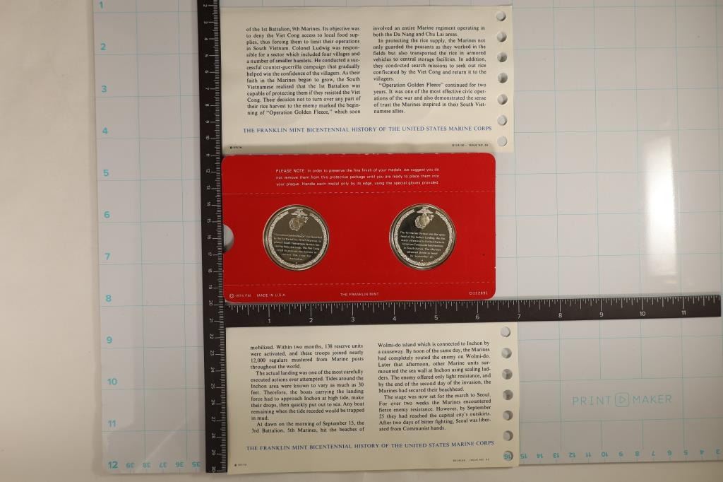 BICENTENNIAL HISTORY OF THE UNITED STATES MARINE CORP. MEDALS: "OPERATION GOLDEN FLEECE" AND "THE INCHON LANDING". FIRST EDITION IN ORIGINAL FRANKLIN MINT PACKAGING.