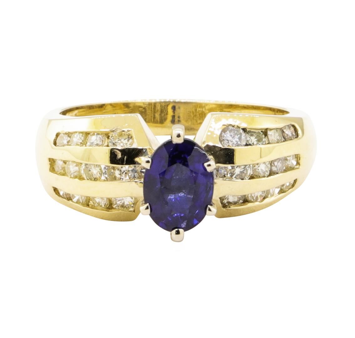 One ring featuring: 14KT yellow gold weighing 5.2 grams containing one blue sapphire weighing 0.92ct and diamonds weighing 0.50ctw.