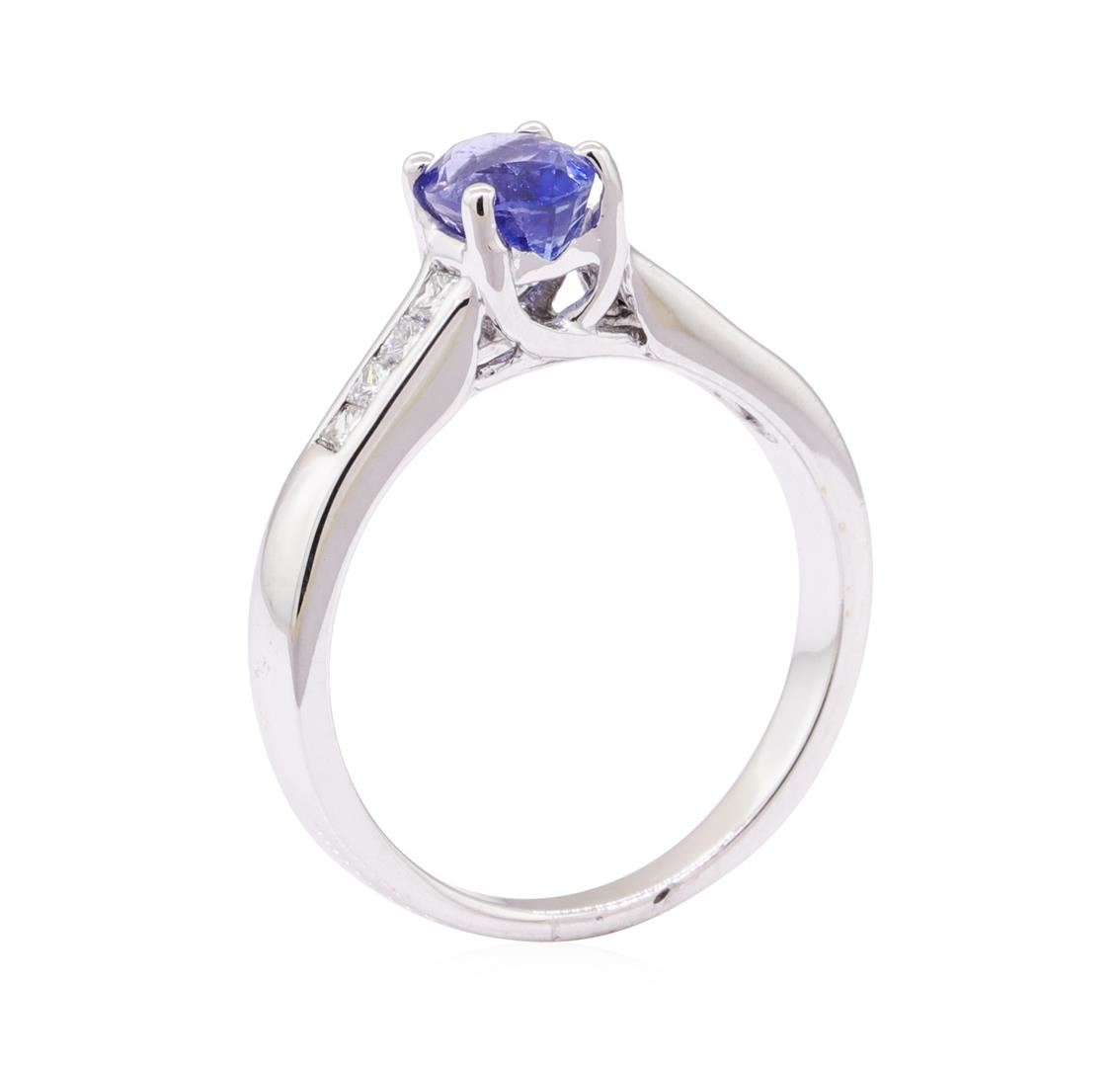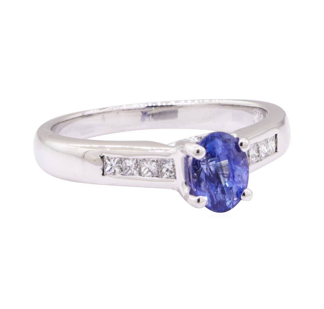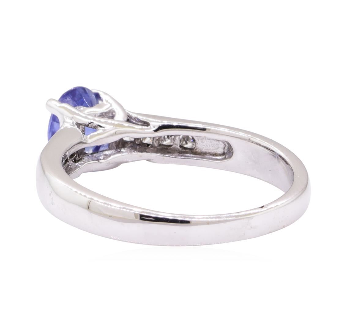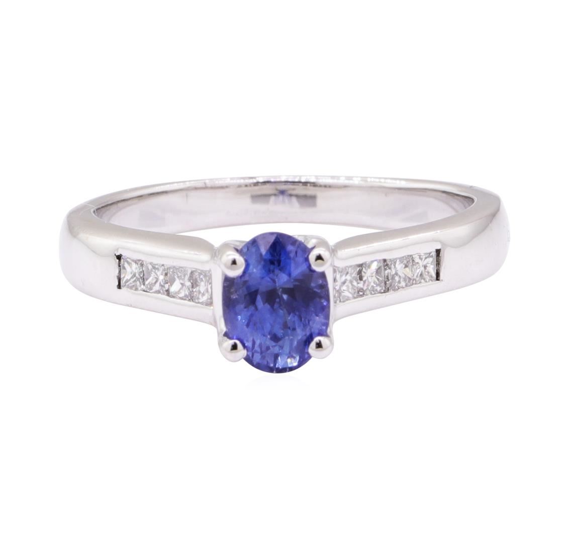 One ring featuring: 18KT white gold weighing 4.7 grams containing one oval cut blue sapphire weighing 1.22ct and diamonds weighing 0.20ctw. The ring has a straight line cathedral motif.