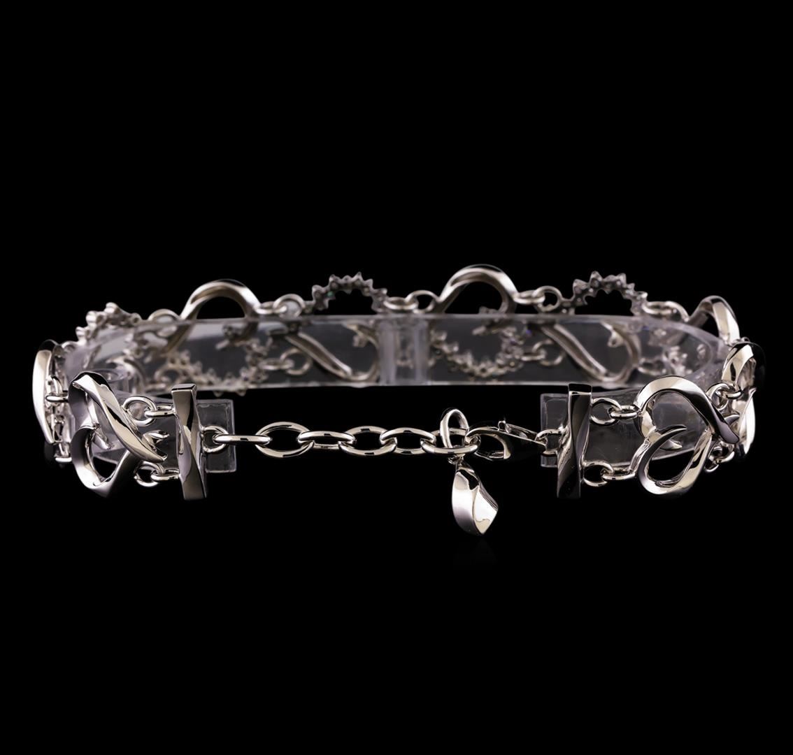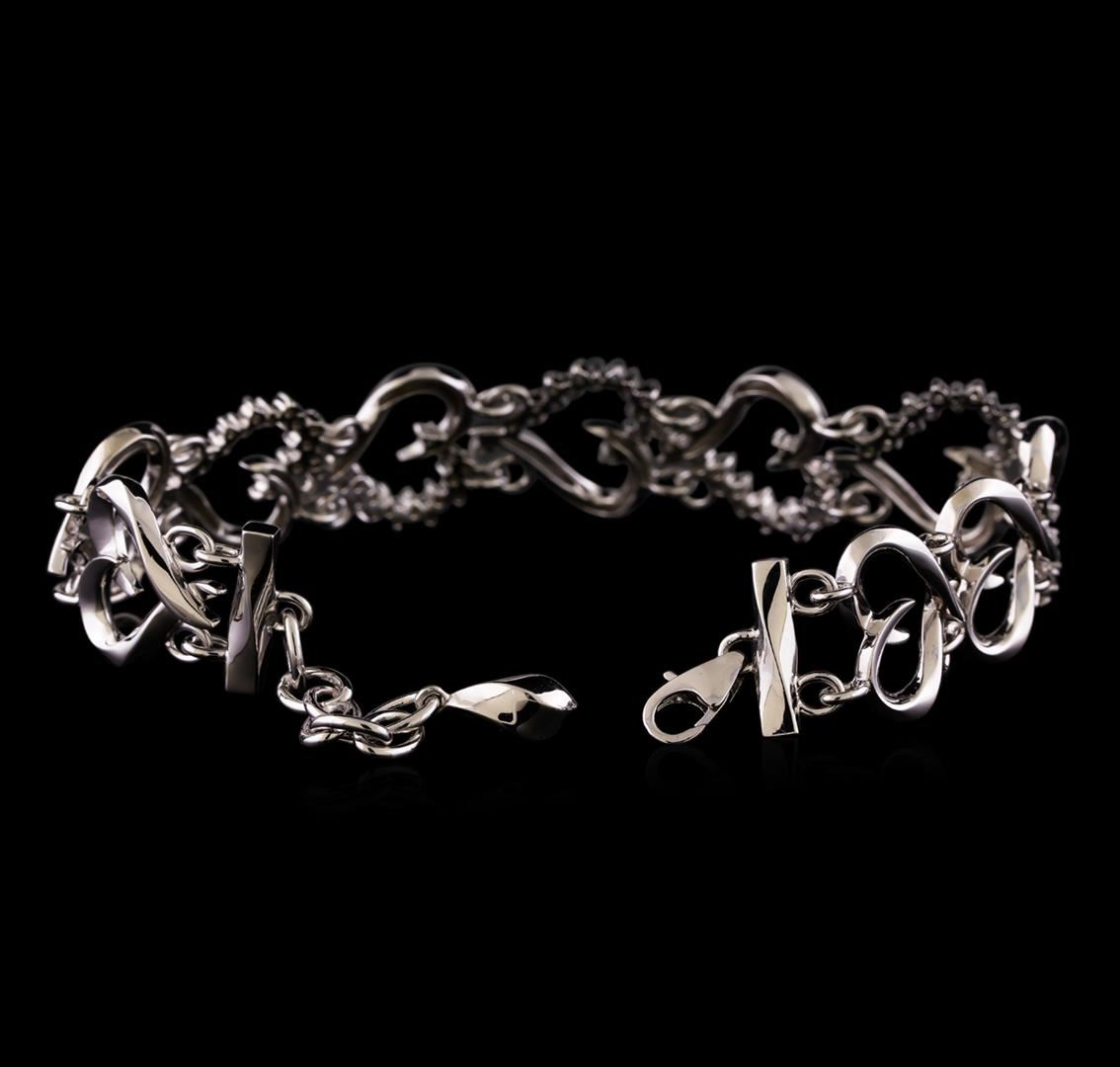 One electronically tested 14KT white gold lady's combination cast & assembled heart shape motif bracelet with a lobster claw clasp with a bright polish finish. The featured lady's bracelet has an adjustable length and can be worn between seven and eight inches long. Identified with markings of 'K14'. Condition is new, good workmanship. Containing: Ninety-Six prong set round brilliant cut diamonds, measuring 1.60 - 1.55 x 0.98mm (depth est.) approximate total weight of 96 Stones = 1.42ct. Graded in the setting. Clarity SI-1 to SI-2. Color: G - H Cut Good. Total Weight of Diamonds 1.42ct.. Total Weight of Bracelet 25.10gm. GAS Appraised at $8,585.00.