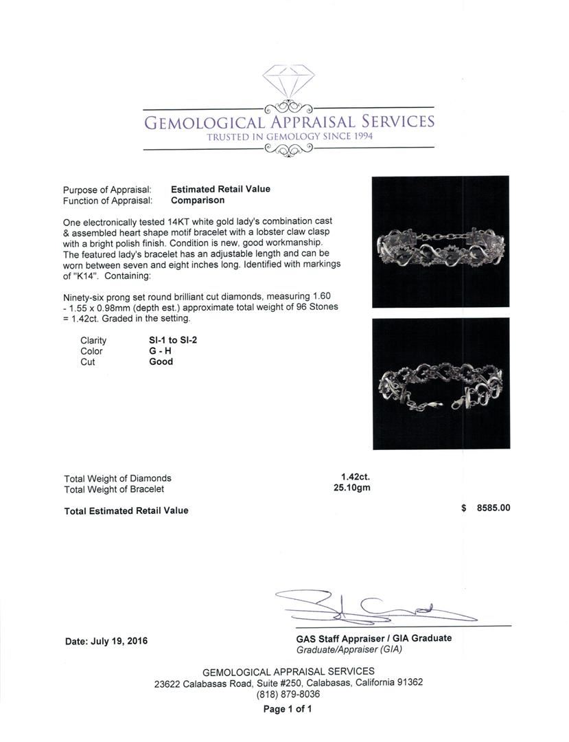 One electronically tested 14KT white gold lady's combination cast & assembled heart shape motif bracelet with a lobster claw clasp with a bright polish finish. The featured lady's bracelet has an adjustable length and can be worn between seven and eight inches long. Identified with markings of 'K14'. Condition is new, good workmanship. Containing: Ninety-Six prong set round brilliant cut diamonds, measuring 1.60 - 1.55 x 0.98mm (depth est.) approximate total weight of 96 Stones = 1.42ct. Graded in the setting. Clarity SI-1 to SI-2. Color: G - H Cut Good. Total Weight of Diamonds 1.42ct.. Total Weight of Bracelet 25.10gm. GAS Appraised at $8,585.00.