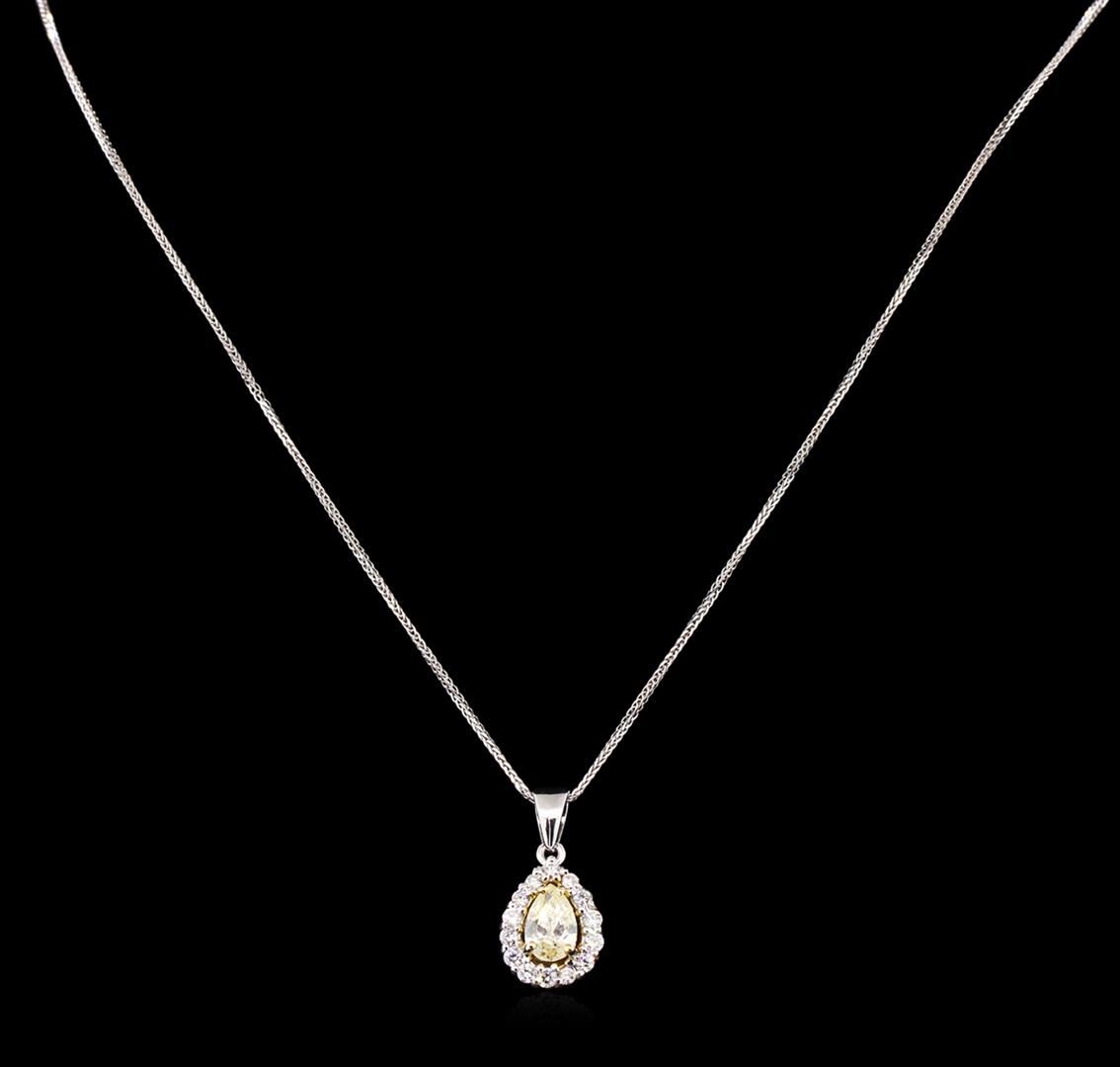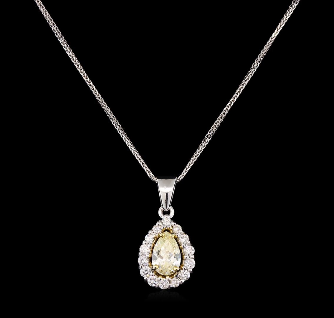 One electronically tested 14KT white gold ladies cast & assembled diamond pendant with chain. The pendant features a pear shaped diamond set within a diamond bezel, supported by an eighteen inch length, one millimeter wide designer style chain. Trademark is Fancy. Identified with markings of "14K ITALY". Condition is new, good workmanship. Containing: One prong set pear shaped cut diamond, measuring 8.20 x 5.50 x 2.80mm, 20.00.%. GTCF approximate weight of 1.00ct with a very strong blue fluorescence. Graded in the setting. Clarity: SI-2. Depth: 50.9%. Table 50.7%. Fourteen prong set round brilliant cut diamonds, measuring 1.90 - 1.80 x 1.15mm exact total weight 14 Stones = 0.42ct. Graded in the setting. Clarity: SI-1 to I-1. Color: G - H. Total Weight of Diamonds 1.42ct. Total Weight of Pendant With Chain 4.07gm. AIG Appraised at $9,050.00.