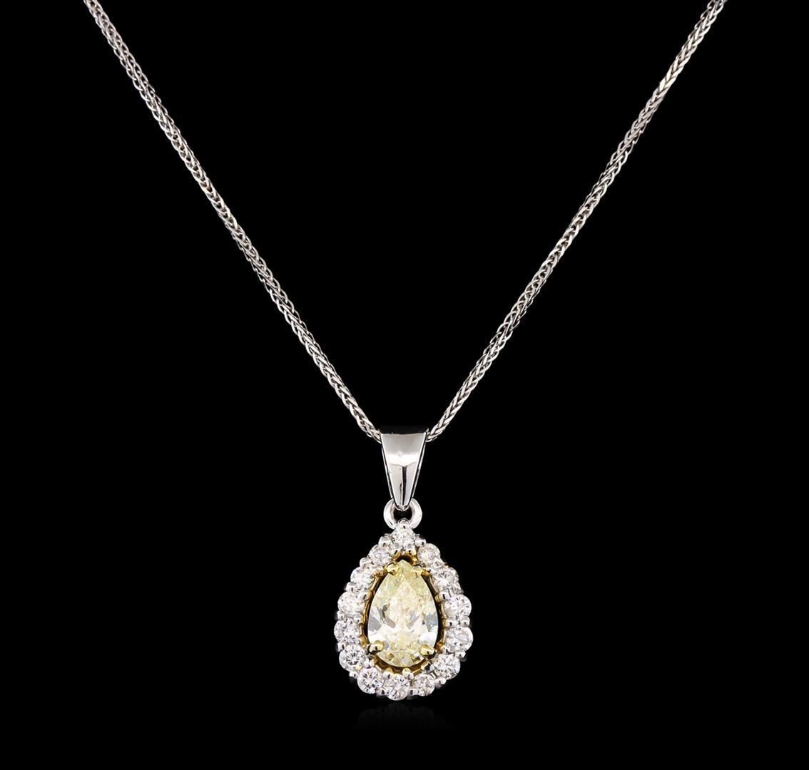 One electronically tested 14KT white gold ladies cast & assembled diamond pendant with chain. The pendant features a pear shaped diamond set within a diamond bezel, supported by an eighteen inch length, one millimeter wide designer style chain. Trademark is Fancy. Identified with markings of "14K ITALY". Condition is new, good workmanship. Containing: One prong set pear shaped cut diamond, measuring 8.20 x 5.50 x 2.80mm, 20.00.%. GTCF approximate weight of 1.00ct with a very strong blue fluorescence. Graded in the setting. Clarity: SI-2. Depth: 50.9%. Table 50.7%. Fourteen prong set round brilliant cut diamonds, measuring 1.90 - 1.80 x 1.15mm exact total weight 14 Stones = 0.42ct. Graded in the setting. Clarity: SI-1 to I-1. Color: G - H. Total Weight of Diamonds 1.42ct. Total Weight of Pendant With Chain 4.07gm. AIG Appraised.