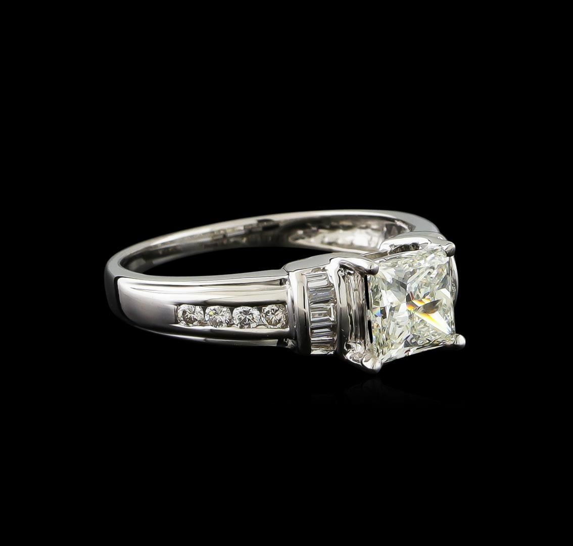 One electronically tested 14KT white gold lady's cast wedding ring with a cathedral shank with a bright polish finish. The featured lady's ring has a shank measuring 1.53 millimeters wide. Identified with markings of "14K". Condition is new, good workmanship. Containing: One prong set princess cut diamond, measuring 5.67 x 5.55 x 3.70mm (depth est.) , 5.00.%. GTCF approximate weight of 1.05ct. Graded in the setting. Clarity: I-1. Color: Good Ten channel set baguette cut (tapered) diamonds, measuring from 1.75 x 1.20 x 1.02mm (depth est.) to 1.80 x 1.20 x 1.02mm (depth est.) approximate total weight of 10 Stones = 0.20ct. Graded in the setting. Clarity: VS-2 to SI-2. Color: F - Good Eight channel set round brilliant cut diamonds, measuring 1.80 - 1.75 x 1.10mm (depth est.) approximate total weight of 8 Stones = 0.17ct. Graded in the setting. Clarity: VS-2 to SI-1. Color: G - Very Good. Total Weight of Diamonds 1.42ct. Total Weight of Ring 2.70gm GAS Appraised at $10,205.00.
