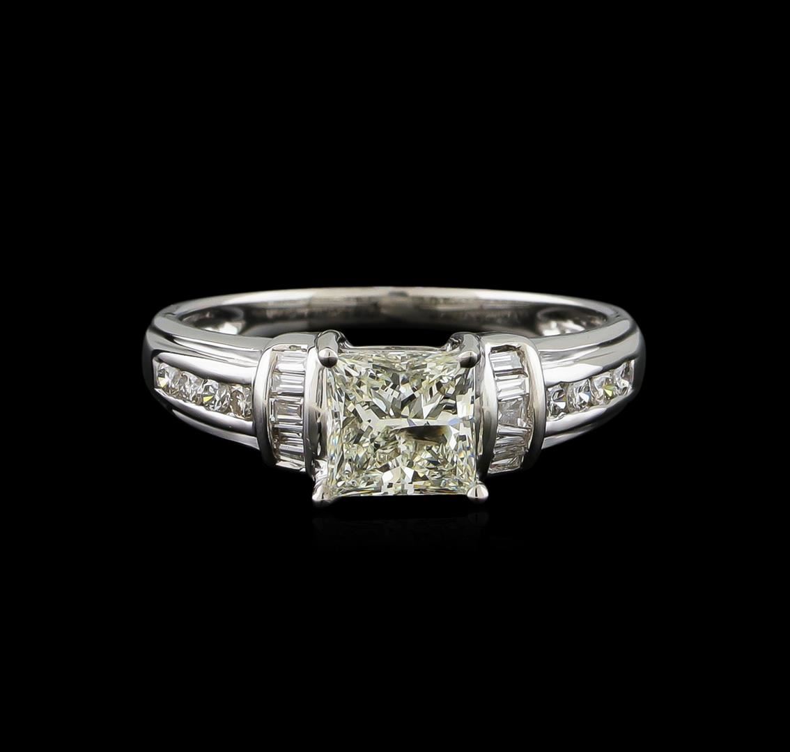One electronically tested 14KT white gold lady's cast wedding ring with a cathedral shank with a bright polish finish. The featured lady's ring has a shank measuring 1.53 millimeters wide. Identified with markings of "14K". Condition is new, good workmanship. Containing: One prong set princess cut diamond, measuring 5.67 x 5.55 x 3.70mm (depth est.) , 5.00.%. GTCF approximate weight of 1.05ct. Graded in the setting. Clarity: I-1. Color: Good Ten channel set baguette cut (tapered) diamonds, measuring from 1.75 x 1.20 x 1.02mm (depth est.) to 1.80 x 1.20 x 1.02mm (depth est.) approximate total weight of 10 Stones = 0.20ct. Graded in the setting. Clarity: VS-2 to SI-2. Color: F - Good Eight channel set round brilliant cut diamonds, measuring 1.80 - 1.75 x 1.10mm (depth est.) approximate total weight of 8 Stones = 0.17ct. Graded in the setting. Clarity: VS-2 to SI-1. Color: G - Very Good. Total Weight of Diamonds 1.42ct. Total Weight of Ring 2.70gm GAS Appraised at $10,205.00.