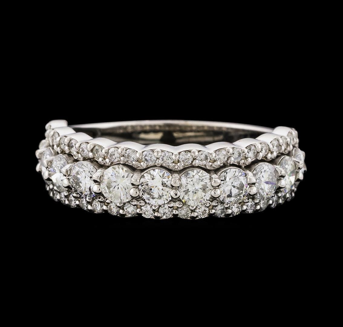 One electronically tested 14KT white gold lady's combination cast & assembled fashion ring with a scalloped straight line shank with a bright polish finish. The featured lady's ring has a shank measuring 2.40 millimeters wide. Identified with markings of 'K14'. Condition is new, good workmanship. Containing: Eleven prong set round brilliant cut diamonds, measuring 3.05 - 2.95 x 1.86mm (depth est.) approximate total weight of 11 Stones = 1.12ct. Graded in the setting. Clarity SI-1 to I-1. Color: G - H Cut Good Forty-Four prong set round brilliant cut diamonds, measuring 1.25 - 1.15 x 0.74mm (depth est.) approximate total weight of 44 Stones = 0.30ct. Graded in the setting. Clarity SI-1 to I-1. Color: G - H Cut Good. Total Weight of Diamonds 1.42ct.. Total Weight of Ring 3.90gm. GAS Appraised.