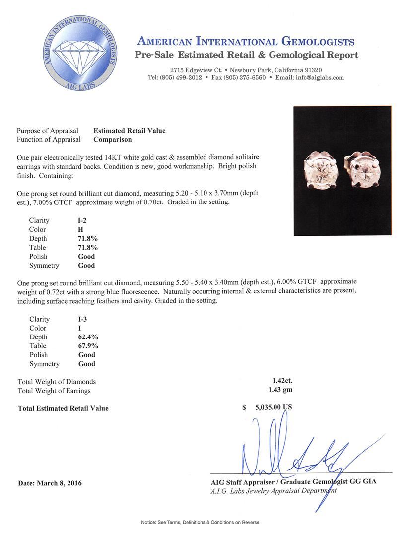 One pair electronically tested 14KT white gold cast & assembled diamond solitaire earrings with standard backs. Bright polish finish. Condition is new, good workmanship. Containing: One prong set round brilliant cut diamond, measuring 5.20 - 5.10 x 3.70mm (depth est.), 7.00.%. GTCF approximate weight of 0.70ct. Graded in the setting. Clarity: I-2. Color: H. Depth 71.8%. Table 71.8%. One prong set round brilliant cut diamond, measuring 5.50 - 5.40 x 3.40mm (depth est.), 6.00.%. GTCF approximate weight of 0.72ct with a strong blue fluorescence. Naturally occurring internal & external characteristics are present, including surface reaching feathers and cavity. Graded in the setting. Clarity: I-3. Color: I. Depth 62.4%. Table 67.9%. Total Weight of Diamonds 1.42ct. Total Weight of Earrings 1.43gm. AIG Appraised at $5,035.00.