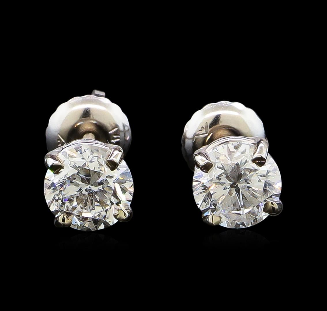 One pair electronically tested 14KT white gold lady's combination cast & assembled diamond stud earrings with threaded posts and screw-on/screw-off backs with a basket setting with a bright polish finish. Identified with markings of "14K". Condition is new, good workmanship. Containing: One prong set round brilliant cut diamond, measuring 5.48 - 5.47 x 3.80mm (depth est.) approximate weight of 0.70ct. Graded in the setting. Clarity: SI-2. Color: G - Good One prong set round brilliant cut diamond, measuring 5.49 - 5.47 x 3.90mm (depth est.) approximate weight of 0.72ct. Graded in the setting. Clarity: I-1. Color: G - Good. Total Weight of Diamonds 1.42ct. Total Weight of Stud Earrings 1.50gm. GAS Appraised at $11,535.00.