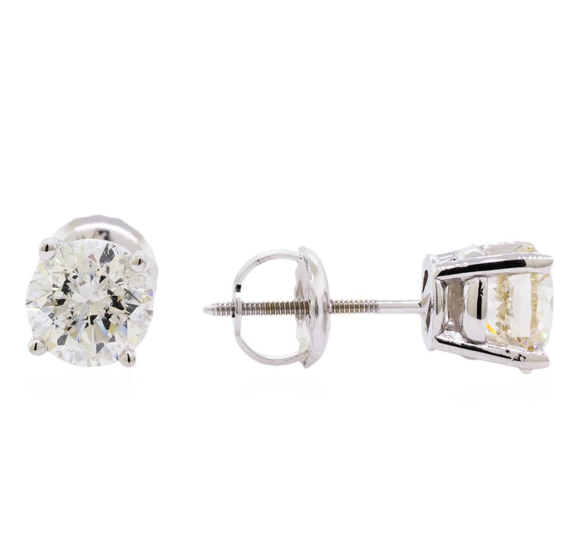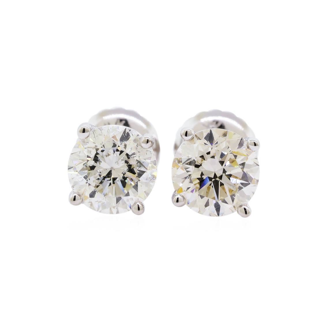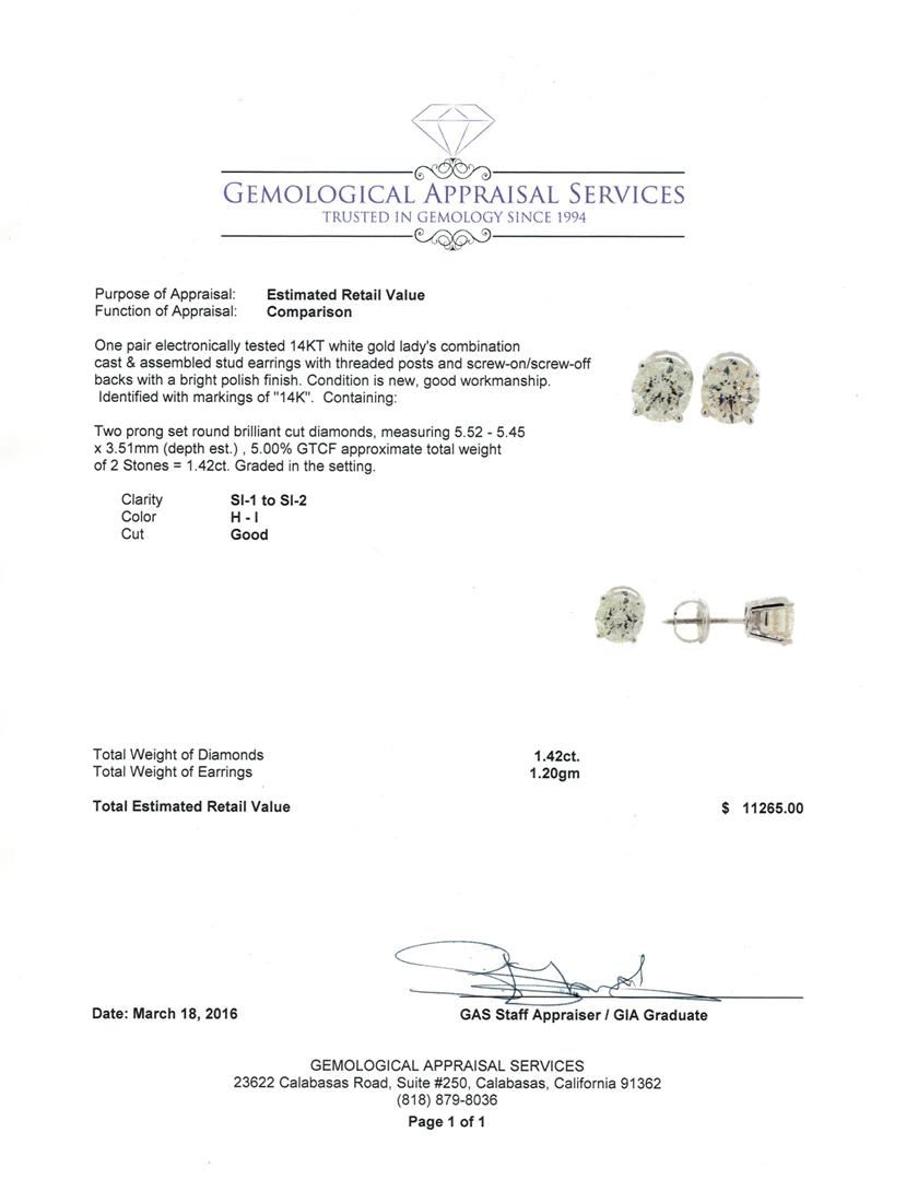 One pair electronically tested 14KT white gold lady's combination cast & assembled stud earrings with threaded posts and screw-on/screw-off backs with a bright polish finish. Identified with markings of "14K". Condition is new, good workmanship. Containing: Two prong set round brilliant cut diamonds, measuring 5.52 - 5.45 x 3.51mm (depth est.) , 5.00.%. GTCF approximate total weight of 2 Stones = 1.42ct. Graded in the setting. Clarity: SI-1 to SI-2. Color: H - I. Cut Good. Total Weight of Diamonds 1.42ct. Total Weight of Earrings 1.20gm. GAS Appraised.