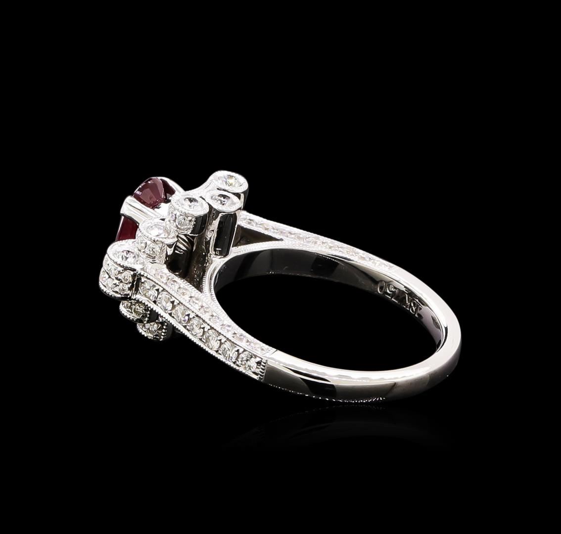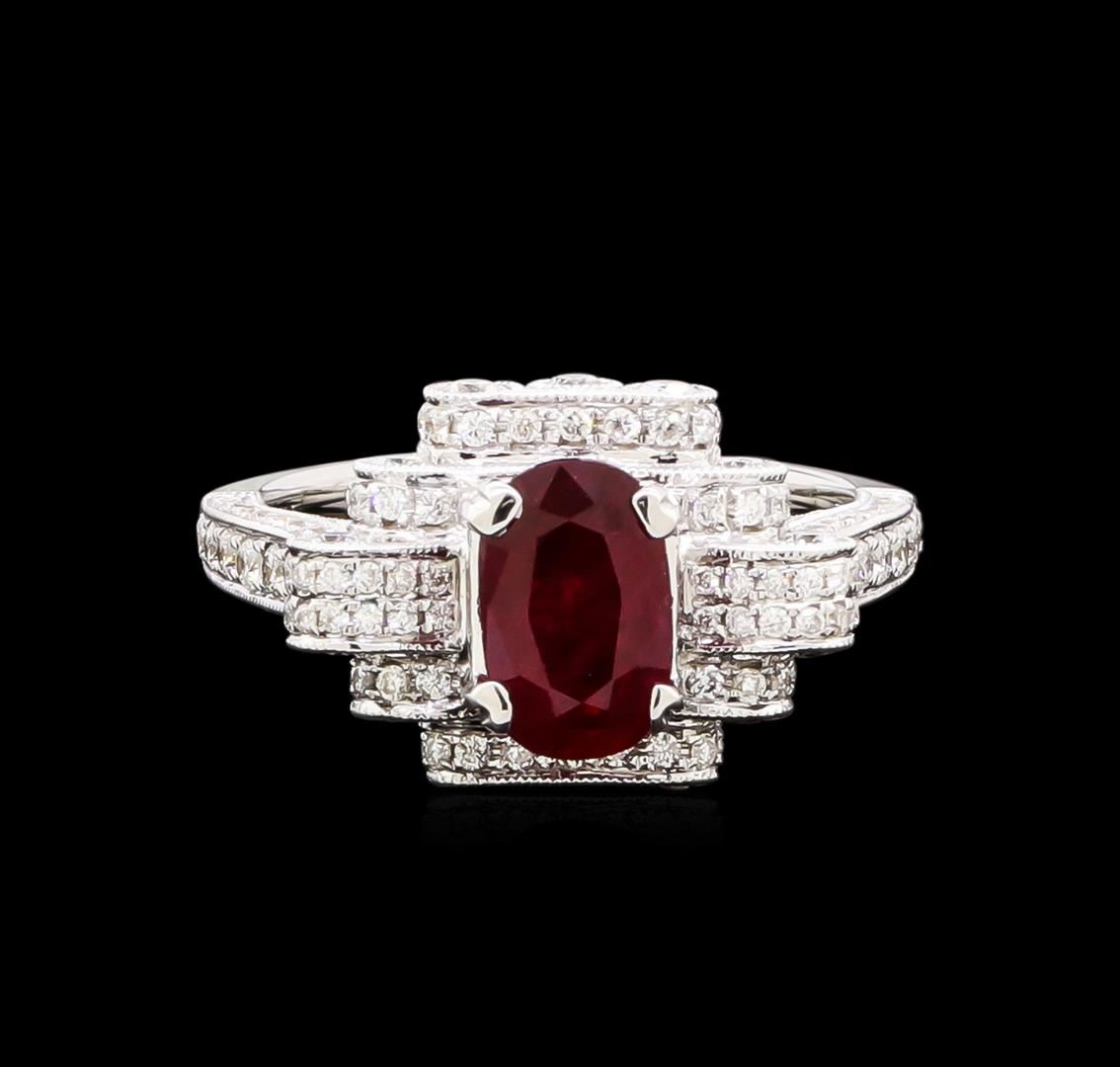 One electronically tested 18KT white gold ladies cast ruby and diamond ring. The featured ruby is set within a stylized gallery of tiered diamond ribbons supported by diamond set shoulders, completed by a two millimeter wide band. Bright polish finish with milgrain detailing. Identified with markings of "18K 750". Condition is new, good workmanship. Containing: One prong set oval mixed cut natural ruby, measuring 8.50 x 5.40 x 3.51mm, 5%. bulge factor, approximate weight of 1.42ct., clarity is heavily included, type II, medium dark, very slightly brownish, red color, (GIA R 6/3), cut is good. Transmitting light somewhat diffusely, transparent to translucent. Naturally occurring internal & external characteristics are present. Graded in the setting. Fourteen bezel set round brilliant cut diamonds, measuring 1.80 - 1.80 x 1.08mm (depth est.) approximate total weight of 14 Stones = 0.33ct. Graded in the setting. Clarity: VS-2 to SI-2. Color: G - I Fourteen prong set round brilliant cut diamonds, measuring 1.50 - 1.50 x 0.90mm (depth est.) approximate total weight of 14 Stones = 0.24ct. Graded in the setting. Clarity: VS-2 to SI-2. Color: G - I Ninety-Eight prong set round brilliant cut diamonds, measuring 1.00 - 0.80 x 0.54mm (depth est.) approximate total weight of 98 Stones = 0.45ct. Graded in the setting. Clarity: VS-2 to SI-2. Color: G - I. Total Weight of Colored Stones 1.42ct. Total Weight of Diamonds 1.02ct. Total Weight of Ring 7.88gm. AIG Appraised at $7,350.00.