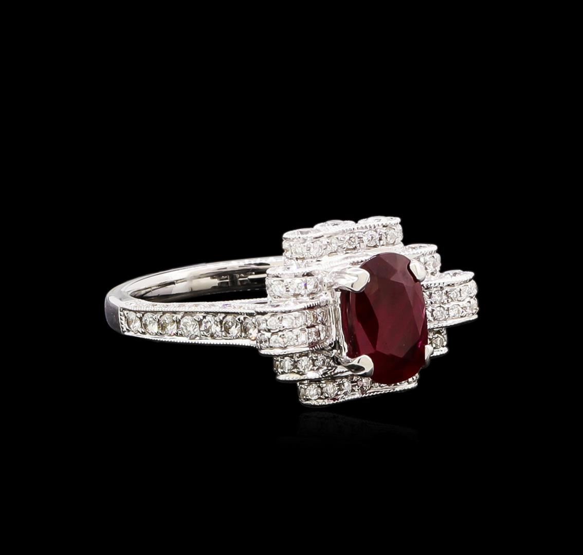One electronically tested 18KT white gold ladies cast ruby and diamond ring. The featured ruby is set within a stylized gallery of tiered diamond ribbons supported by diamond set shoulders, completed by a two millimeter wide band. Bright polish finish with milgrain detailing. Identified with markings of "18K 750". Condition is new, good workmanship. Containing: One prong set oval mixed cut natural ruby, measuring 8.50 x 5.40 x 3.51mm, 5%. bulge factor, approximate weight of 1.42ct., clarity is heavily included, type II, medium dark, very slightly brownish, red color, (GIA R 6/3), cut is good. Transmitting light somewhat diffusely, transparent to translucent. Naturally occurring internal & external characteristics are present. Graded in the setting. Fourteen bezel set round brilliant cut diamonds, measuring 1.80 - 1.80 x 1.08mm (depth est.) approximate total weight of 14 Stones = 0.33ct. Graded in the setting. Clarity: VS-2 to SI-2. Color: G - I Fourteen prong set round brilliant cut diamonds, measuring 1.50 - 1.50 x 0.90mm (depth est.) approximate total weight of 14 Stones = 0.24ct. Graded in the setting. Clarity: VS-2 to SI-2. Color: G - I Ninety-Eight prong set round brilliant cut diamonds, measuring 1.00 - 0.80 x 0.54mm (depth est.) approximate total weight of 98 Stones = 0.45ct. Graded in the setting. Clarity: VS-2 to SI-2. Color: G - I. Total Weight of Colored Stones 1.42ct. Total Weight of Diamonds 1.02ct. Total Weight of Ring 7.88gm. AIG Appraised at $7,350.00.