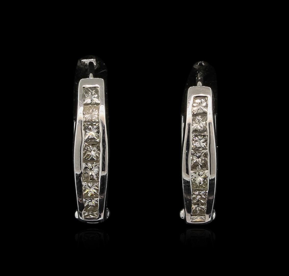 One pair electronically tested 18KT white gold ladies cast & assembled diamond hoop earrings with hinged, snap locking posts. Bright polish finish. Identified with markings of "18K". Condition is new, good workmanship. Containing: Eight channel set princess cut diamonds, measuring 2.40 x 2.40 x 1.80mm (depth est.) approximate. Total Weight of 8 Stones = 0.78ct. Graded in the setting. Clarity: VS-2 to SI-1. Color: H - J Eight channel set princess cut diamonds, measuring 2.30 x 2.20 x 1.65mm (depth est.) approximate. Total Weight of 8 Stones = 0.64ct. Graded in the setting. Clarity: VS-2 to SI-1. Color: H - J. Total Weight of Diamonds 1.42ct. Total Weight of Earrings 6.99gm. AIG Appraised at $5,230.00.