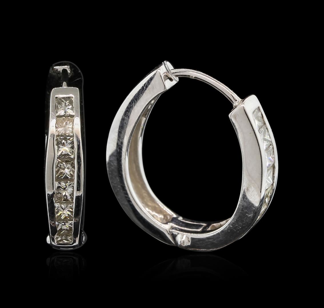 One pair electronically tested 18KT white gold ladies cast & assembled diamond hoop earrings with hinged, snap locking posts. Bright polish finish. Identified with markings of "18K". Condition is new, good workmanship. Containing: Eight channel set princess cut diamonds, measuring 2.40 x 2.40 x 1.80mm (depth est.) approximate. Total Weight of 8 Stones = 0.78ct. Graded in the setting. Clarity: VS-2 to SI-1. Color: H - J Eight channel set princess cut diamonds, measuring 2.30 x 2.20 x 1.65mm (depth est.) approximate. Total Weight of 8 Stones = 0.64ct. Graded in the setting. Clarity: VS-2 to SI-1. Color: H - J. Total Weight of Diamonds 1.42ct. Total Weight of Earrings 6.99gm. AIG Appraised at $5,230.00.