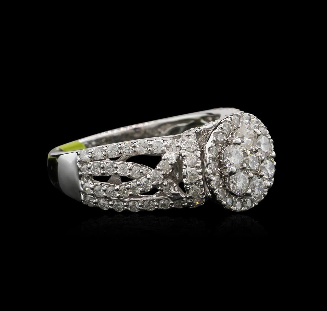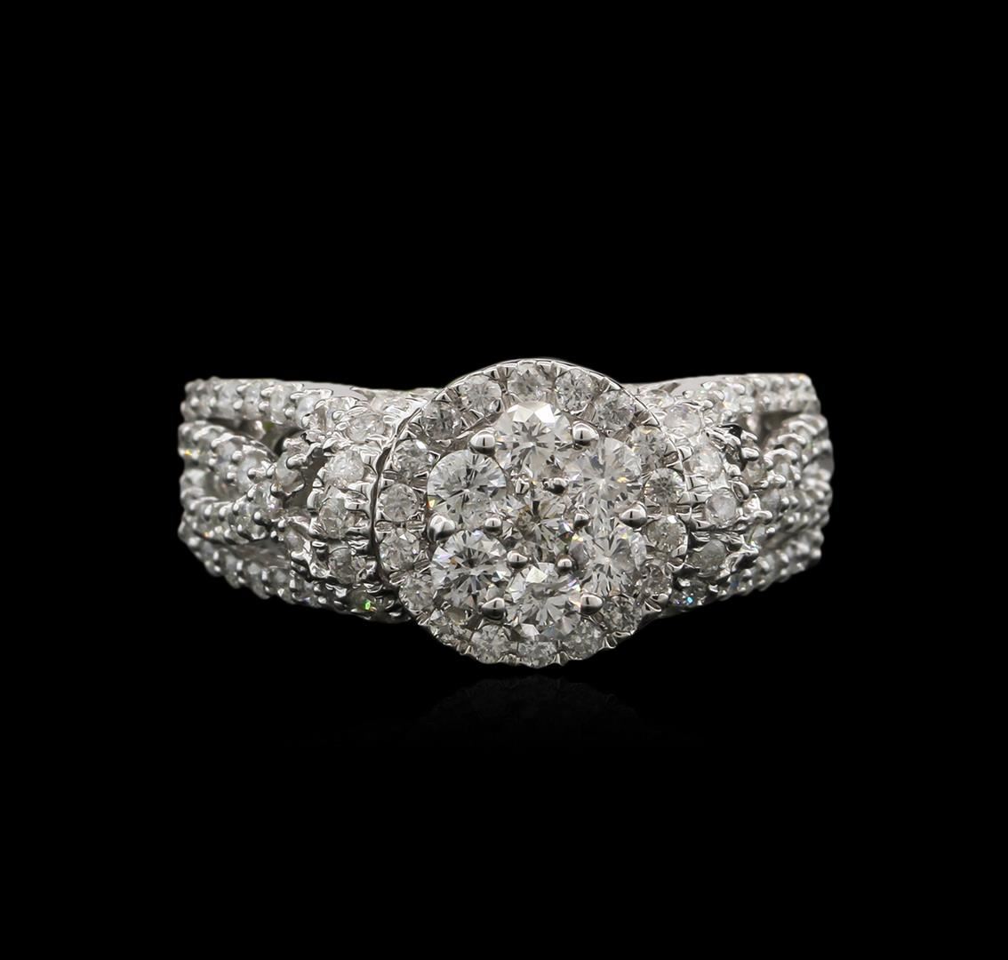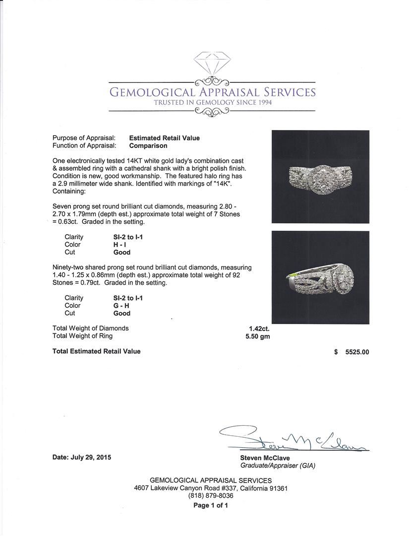 One electronically tested 14KT white gold lady's combination cast & assembled ring with a cathedral shank with a bright polish finish. The featured halo ring has a 2.9 millimeter wide shank. Identified with markings of "14K". Condition is new, good workmanship. Containing: Seven prong set round brilliant cut diamonds, measuring 2.80 - 2.70 x 1.79mm (depth est.) approximate. Total Weight of 7 Stones = 0.63ct. Graded in the setting. Clarity: SI-2 to I-1. Color: H - I. Cut Good Ninety-Two shared prong set round brilliant cut diamonds, measuring 1.40 - 1.25 x 0.86mm (depth est.) approximate. Total Weight of 92 Stones = 0.79ct. Graded in the setting. Clarity: SI-2 to I-1. Color: G - Good. Total Weight of Diamonds 1.42ct. Total Weight of Ring 5.50gm. GAS Appraised at $5,525.00.