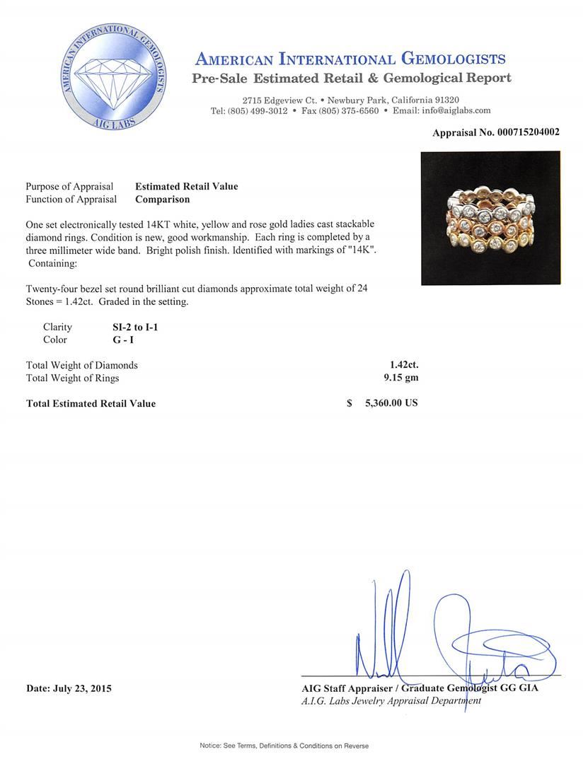 One set electronically tested 14KT white, yellow and rose gold ladies cast stackable diamond rings. Each ring is completed by a three millimeter wide band. Bright polish finish. Identified with markings of "14K". Condition is new, good workmanship. Containing: Twenty-Four bezel set round brilliant cut diamonds approximate. Total Weight of 24 Stones = 1.42ct. Graded in the setting. Clarity: SI-2 to I-1. Color: G - I. Total Weight of Diamonds 1.42ct. Total Weight of Rings 9.15gm. AIG Appraised at $5,360.00.