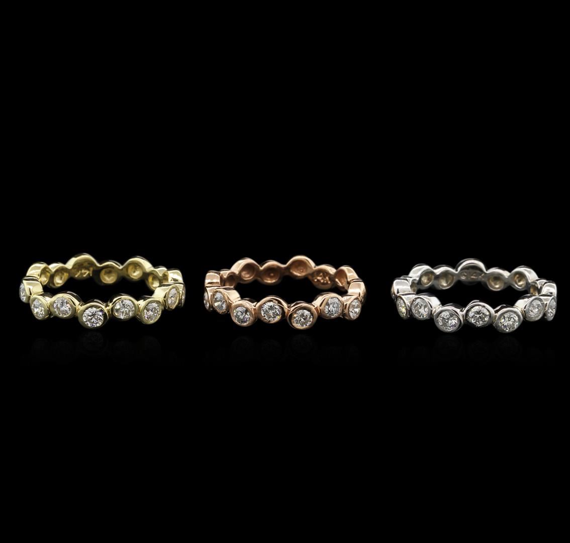One set electronically tested 14KT white, yellow and rose gold ladies cast stackable diamond rings. Each ring is completed by a three millimeter wide band. Bright polish finish. Identified with markings of "14K". Condition is new, good workmanship. Containing: Twenty-Four bezel set round brilliant cut diamonds approximate. Total Weight of 24 Stones = 1.42ct. Graded in the setting. Clarity: SI-2 to I-1. Color: G - I. Total Weight of Diamonds 1.42ct. Total Weight of Rings 9.15gm. AIG Appraised at $5,360.00.