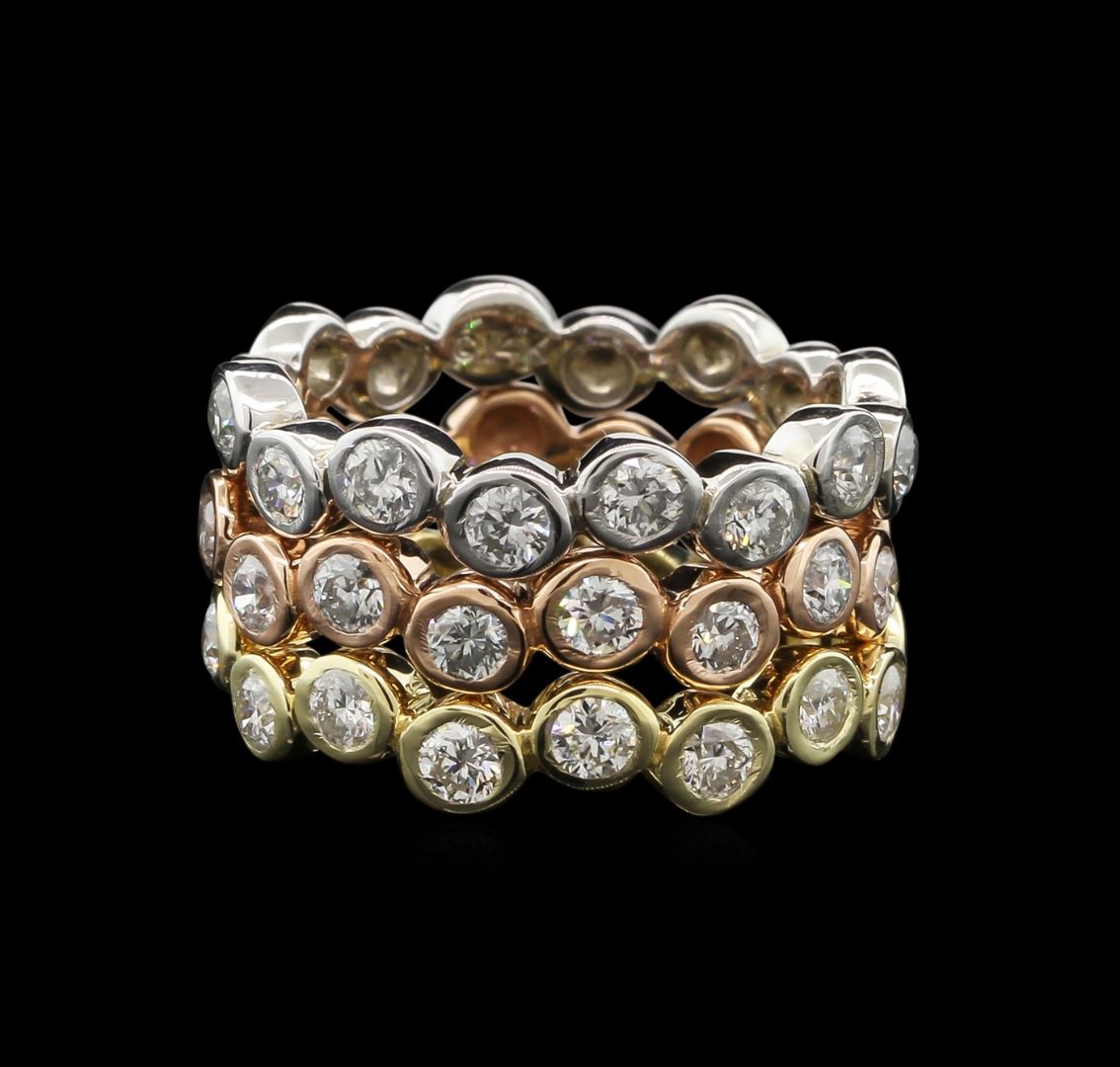 One set electronically tested 14KT white, yellow and rose gold ladies cast stackable diamond rings. Each ring is completed by a three millimeter wide band. Bright polish finish. Identified with markings of "14K". Condition is new, good workmanship. Containing: Twenty-Four bezel set round brilliant cut diamonds approximate. Total Weight of 24 Stones = 1.42ct. Graded in the setting. Clarity: SI-2 to I-1. Color: G - I. Total Weight of Diamonds 1.42ct. Total Weight of Rings 9.15gm. AIG Appraised at $5,360.00.