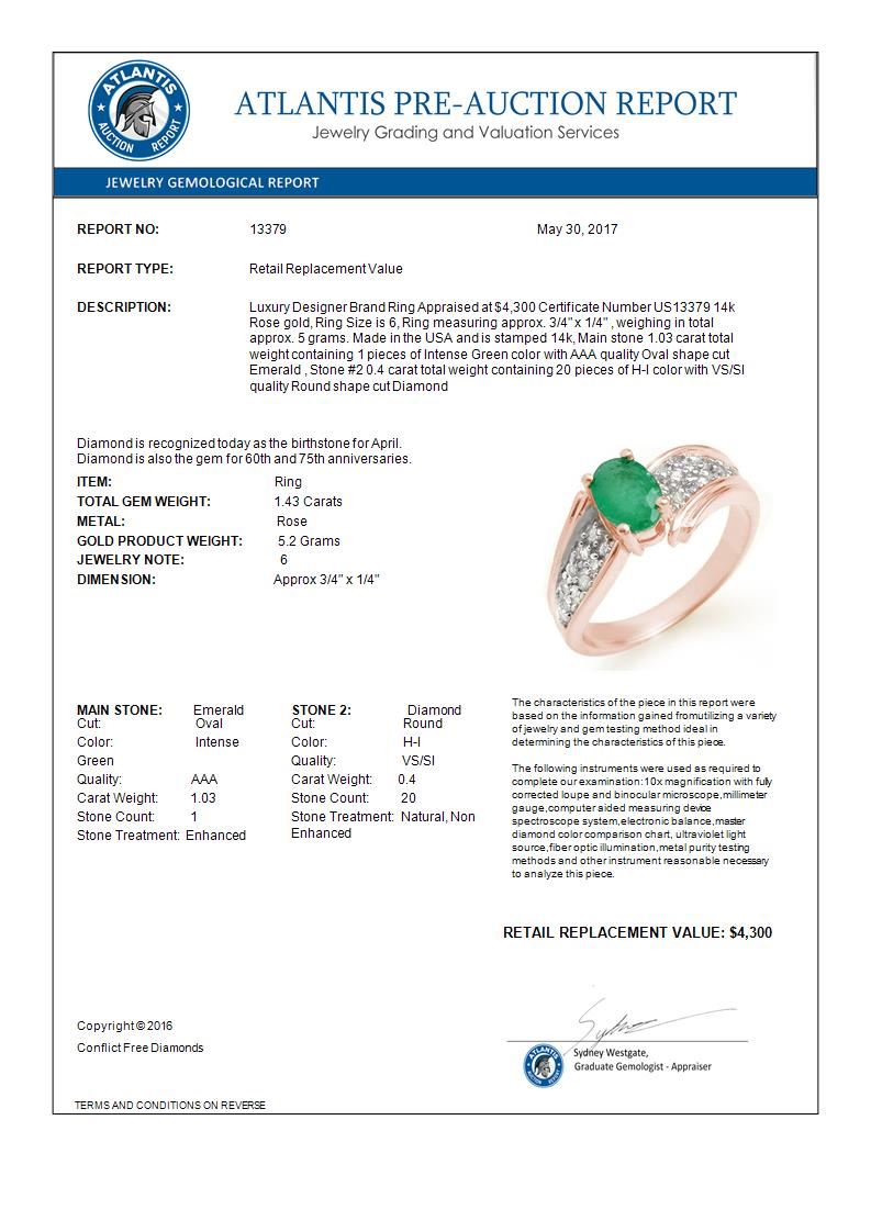 1.43 CTW Emerald & Diamond Ring 14K Rose Gold ---- Luxury Designer Brand Ring Appraised Retail Price at $4,300 ---- SKU Number US13379 14k Rose gold Ring Size is 6, Ring measuring approx. 3/4" x 1/4" , weighing in total approx. 5 grams. Made in the USA and is stamped 14k, Main stone 1.03 carat total weight containing 1 pieces of Intense Green color with AAA quality Oval shape cut Emerald , Stone #2 0.4 carat total weight containing 20 pieces of H-I color with VS/SI quality Round shape cut